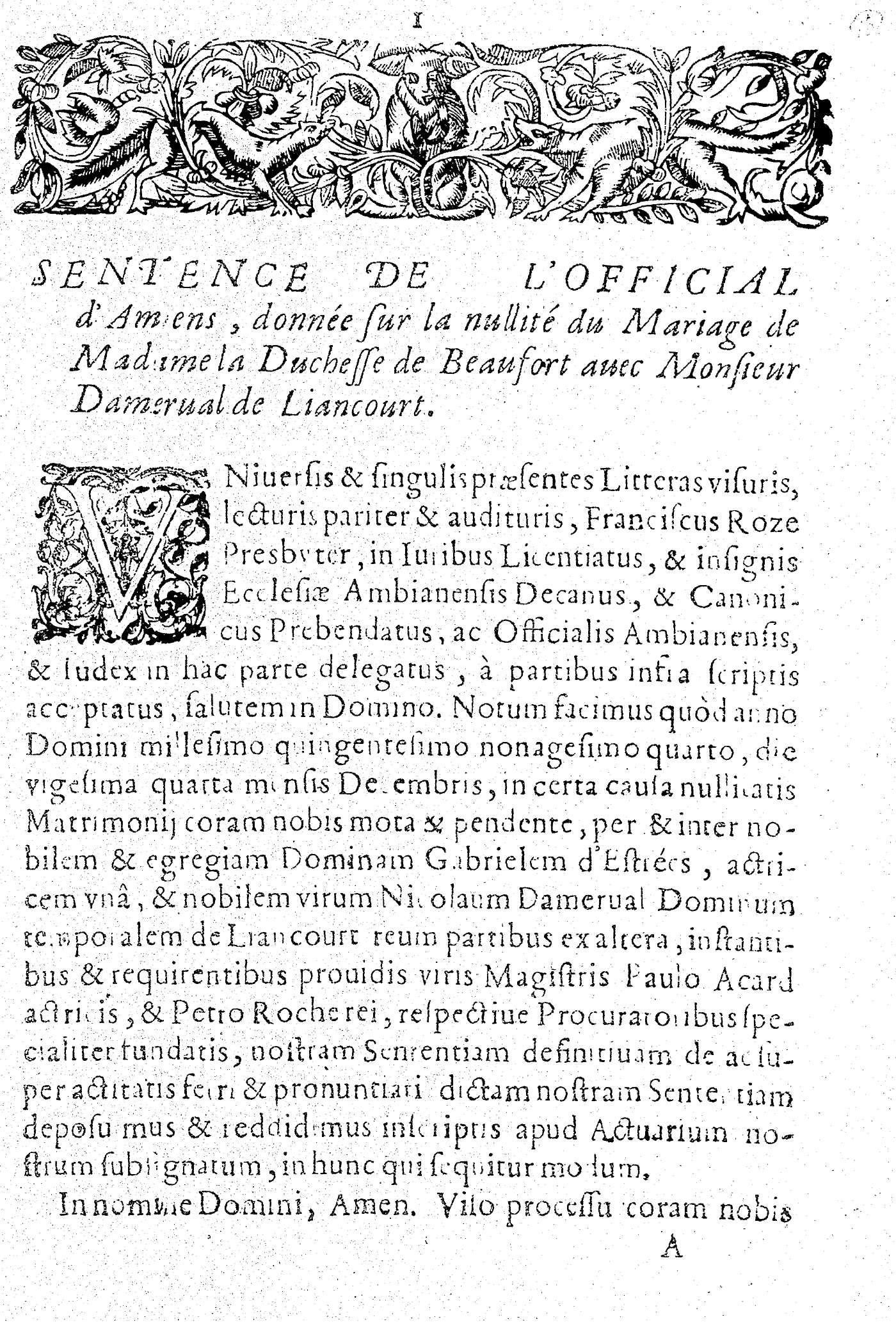 SENTENCE DE L’OFFICIAL d’Amiens, donnée sur la nullité du Mariage de Madame la Duchesse de Beaufort auec Monsieur Damerual de Liancourt.
