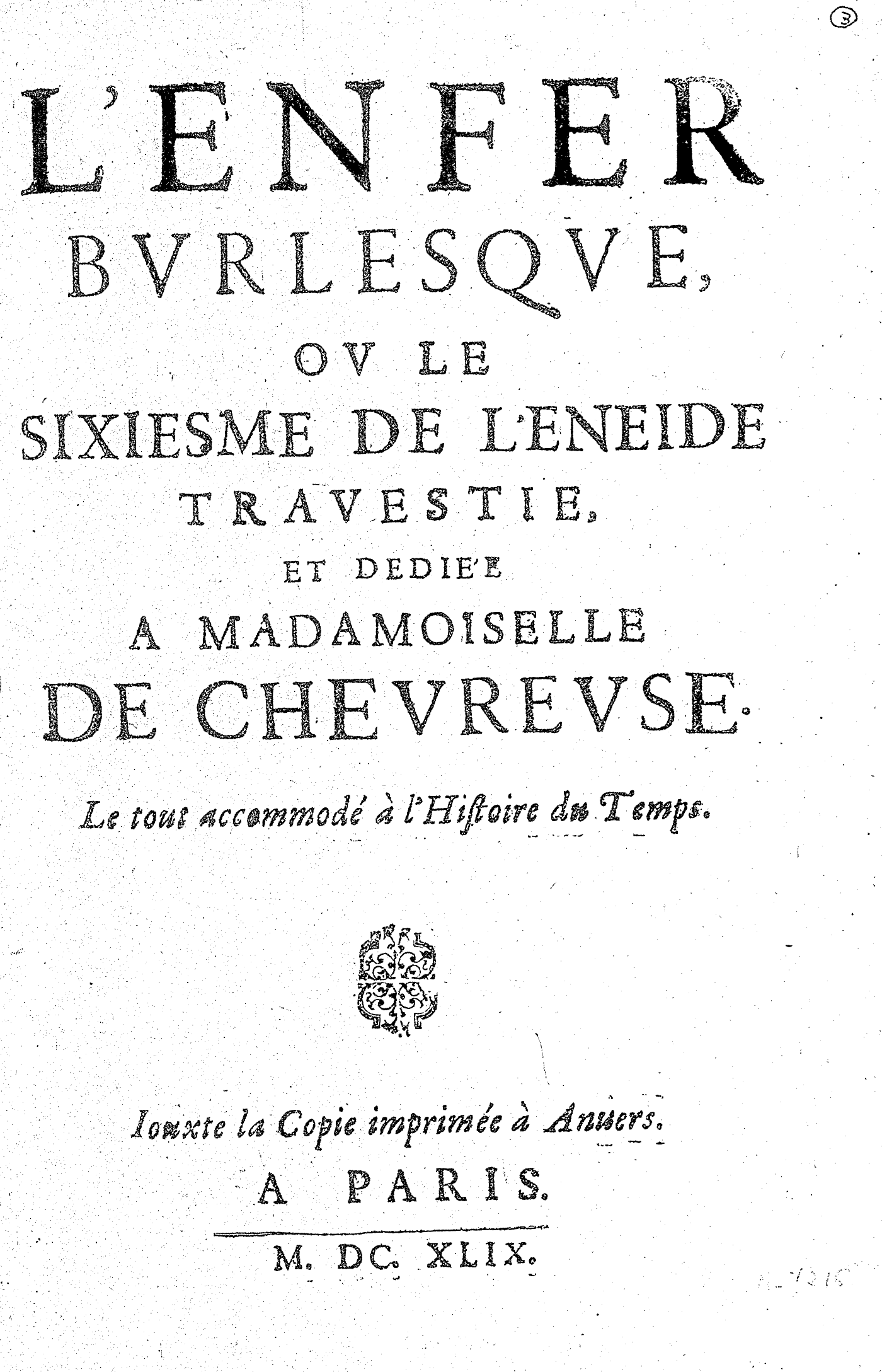 L’ENFER BVRLESQVE, OV LE SIXIESME DE L’ENEIDE TRAVESTIE, ET DEDIÉE A MADAMOISELLE DE CHEVREVSE. Le tout accommodé à l’Histoire du Temps.