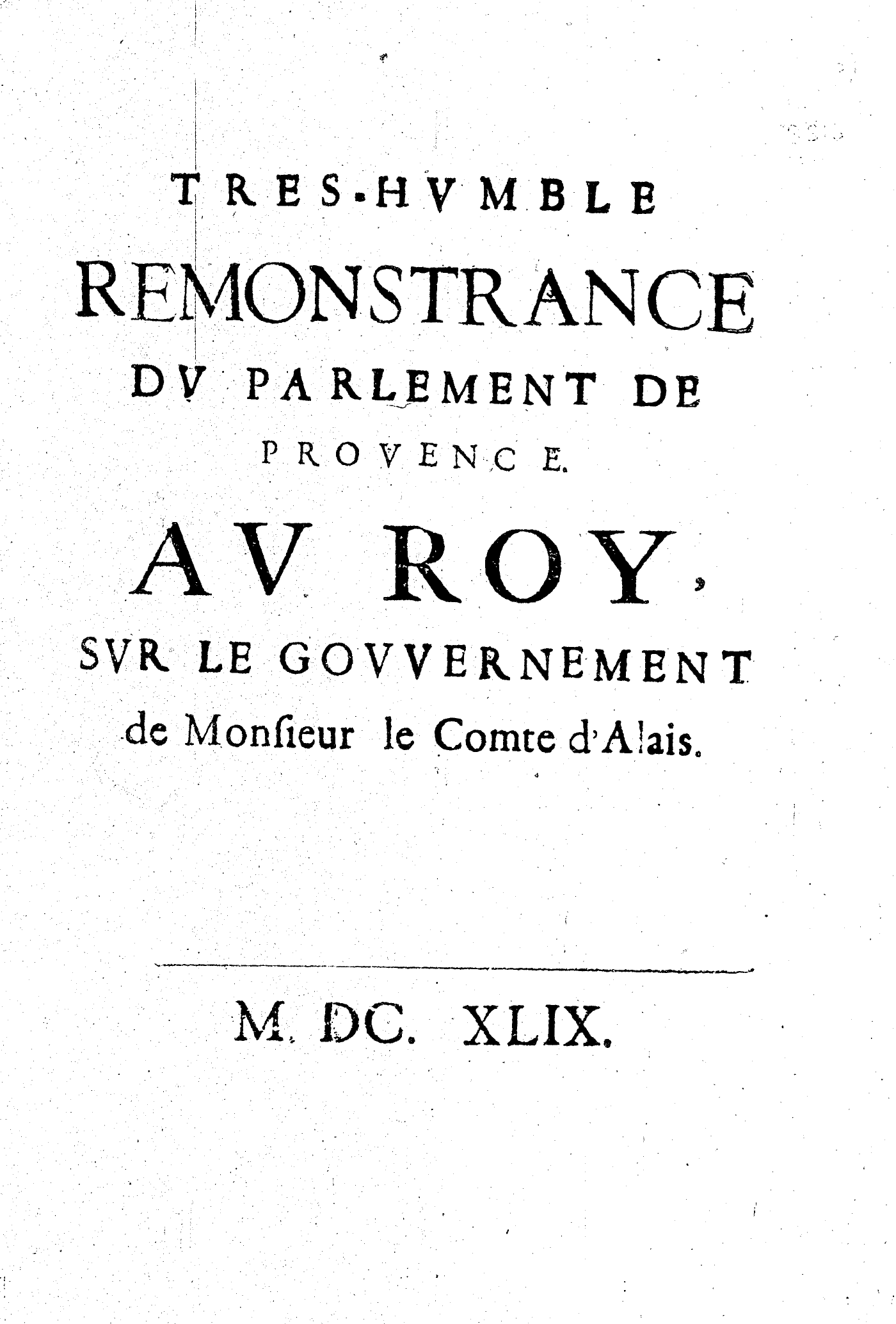TRES-HVMBLE REMONSTRANCE DV PARLEMENT DE PROVENCE. AV ROY, SVR LE GOVVERNEMENT de Monsieur le Comte d’Alais.