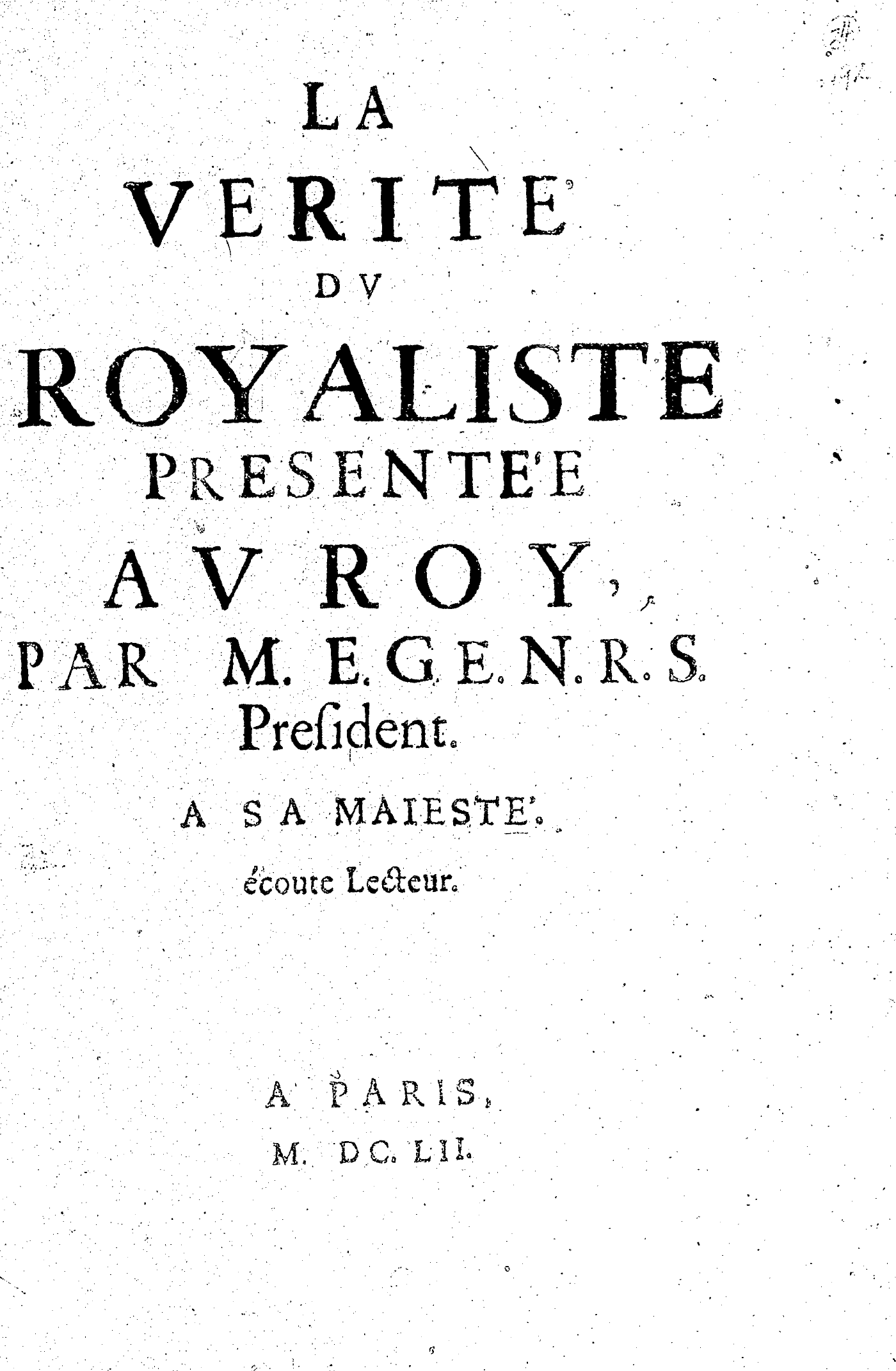LA VERITÉ DV ROYALISTE PRESENTÉE AV ROY, PAR M. E. G. E. N. R. S. President. A SA MAIESTÉ. écoute Lecteur.