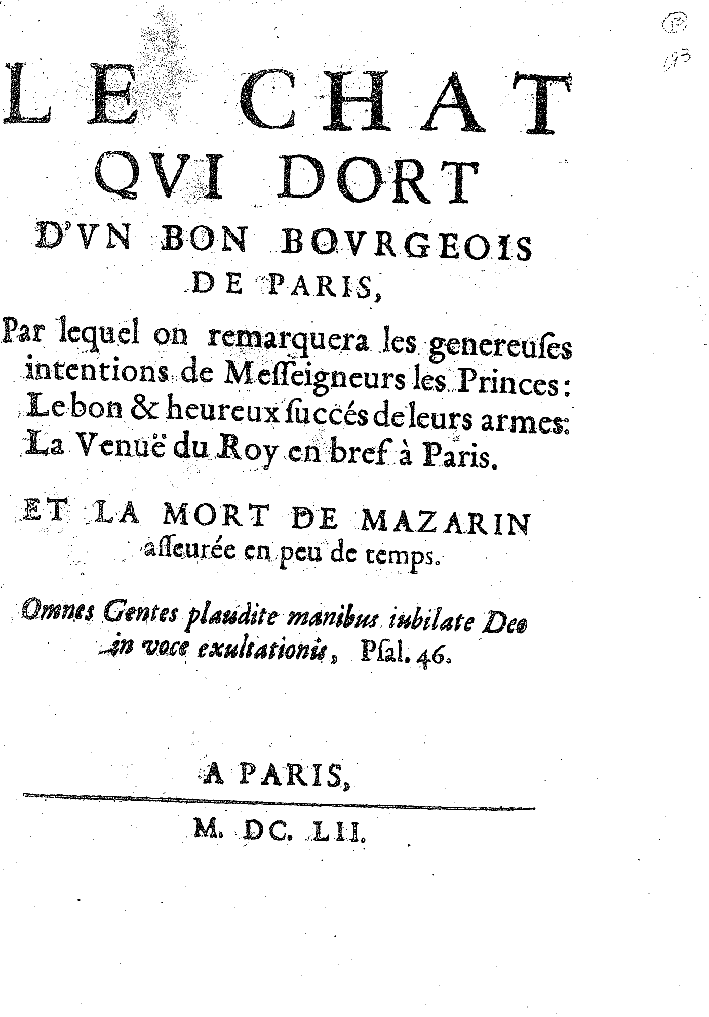 LE CHAT QVI DORT D’VN BON BOVRGEOIS DE PARIS, Par lequel on remarquera les genereuses intentions de Messeigneurs les Princes : Le bon & heureux succés de leurs armes : La Venuë du Roy en bref à Paris. ET LA MORT DE MAZARIN asseurée en peu de temps. Omnes Gentes plaudite manibus iubilate Deo in voce exultationis, Psal. 46.