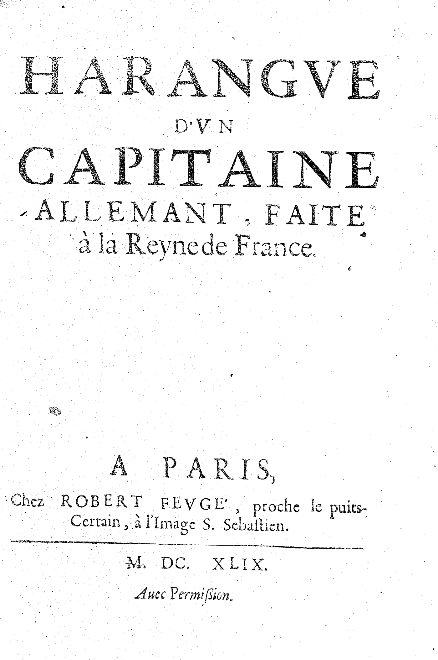 HARANGVE D’VN CAPITAINE ALLEMANT, FAITE à la Reyne de France.