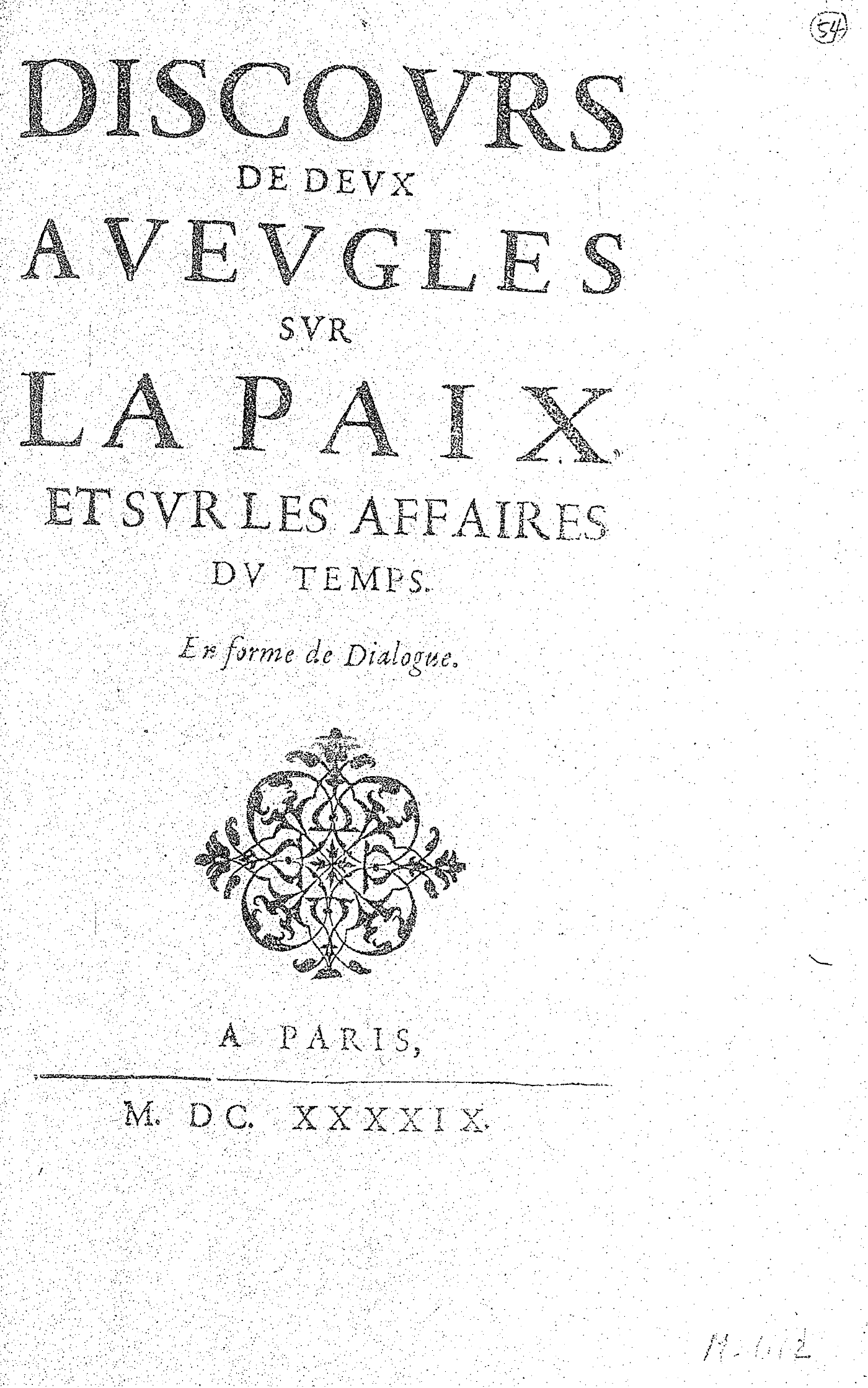 DISCOVRS DE DEVX AVEVGLES SVR LA PAIX, ET SVR LES AFFAIRES DV TEMPS. En forme de Dialogue.
