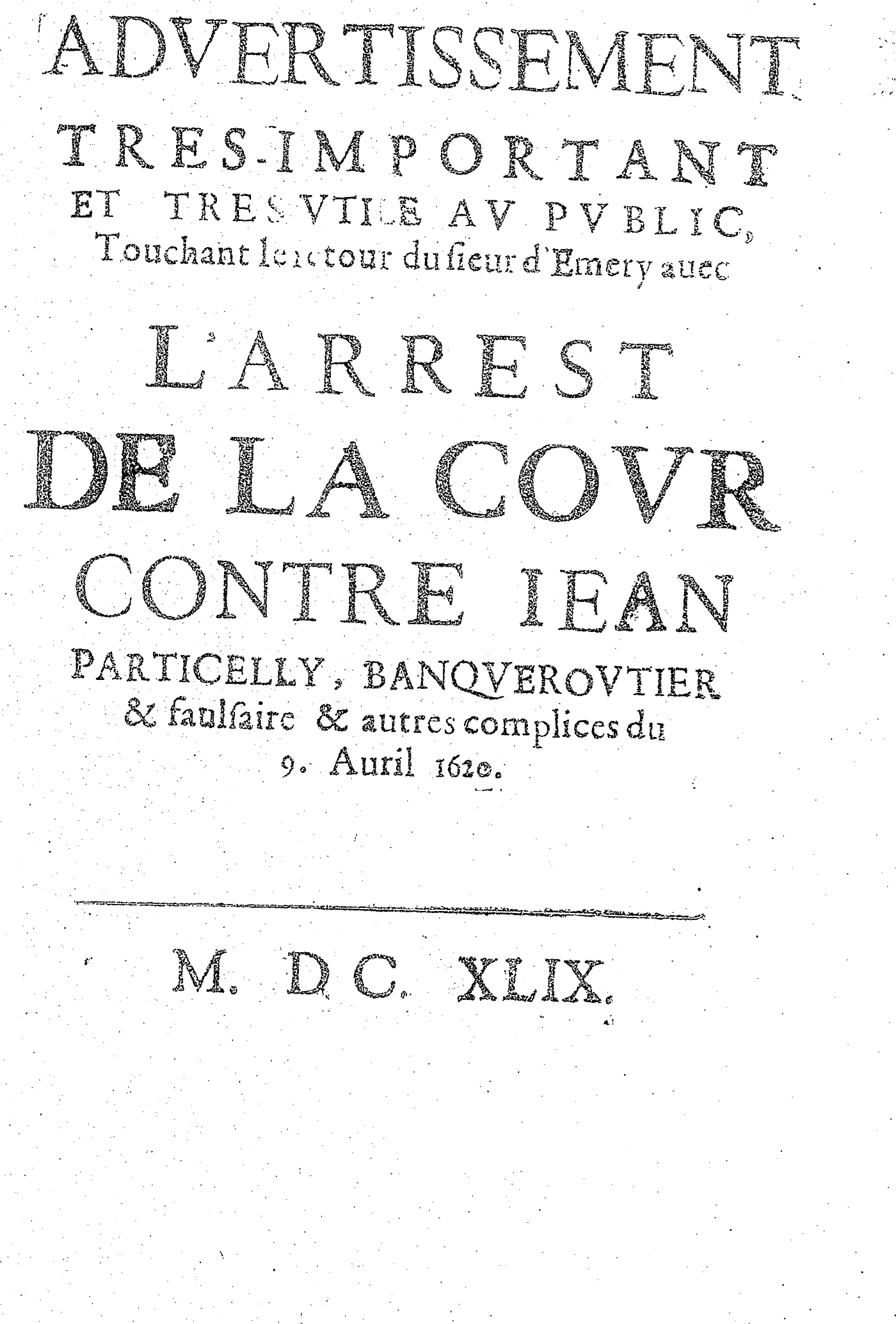 ADVERTISSEMENT TRES-IMPORTANT ET TRES VTILE AV PVBLIC, Touchant le retour du sieur d’Emery auec L’ARREST DE LA COVR CONTRE IEAN PARTICELLY, BANQVEROVTIER & faulsaire & autres complices du 9. Auril 1620.