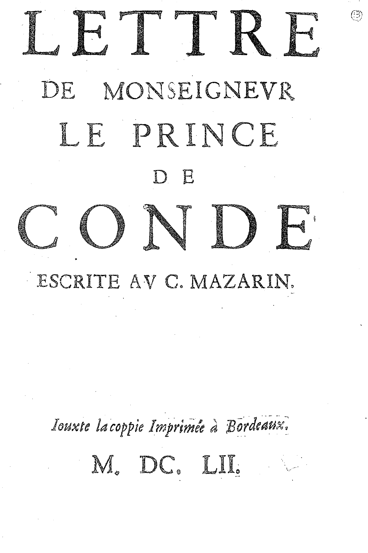 LETTRE DE MONSEIGNEVR LE PRINCE DE CONDÉ ESCRITE AV C. MAZARIN.