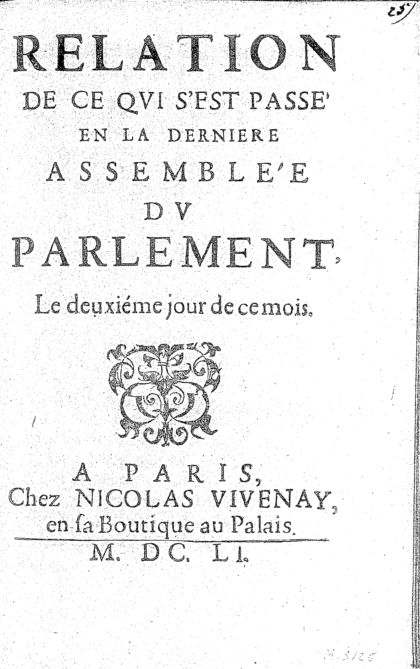 RELATION DE CE QVI S’EST PASSÉ EN LA DERNIERE ASSEMBLÉE DV PARLEMENT, Le deuxiéme jour de ce mois.