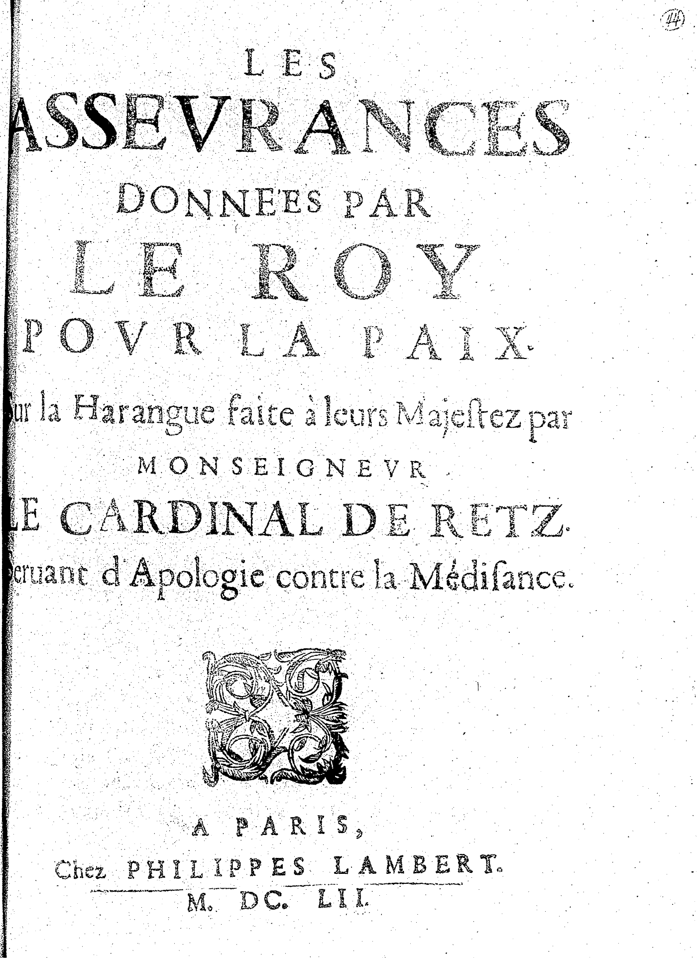 LES ASSEVRANCES DONNÉES PAR LE ROY POVR LA PAIX. Sur la Harangue faite à leurs Majestez par MONSEIGNEVR LE CARDINAL DE RETZ. Seruant d’Apologie contre la Médisance.