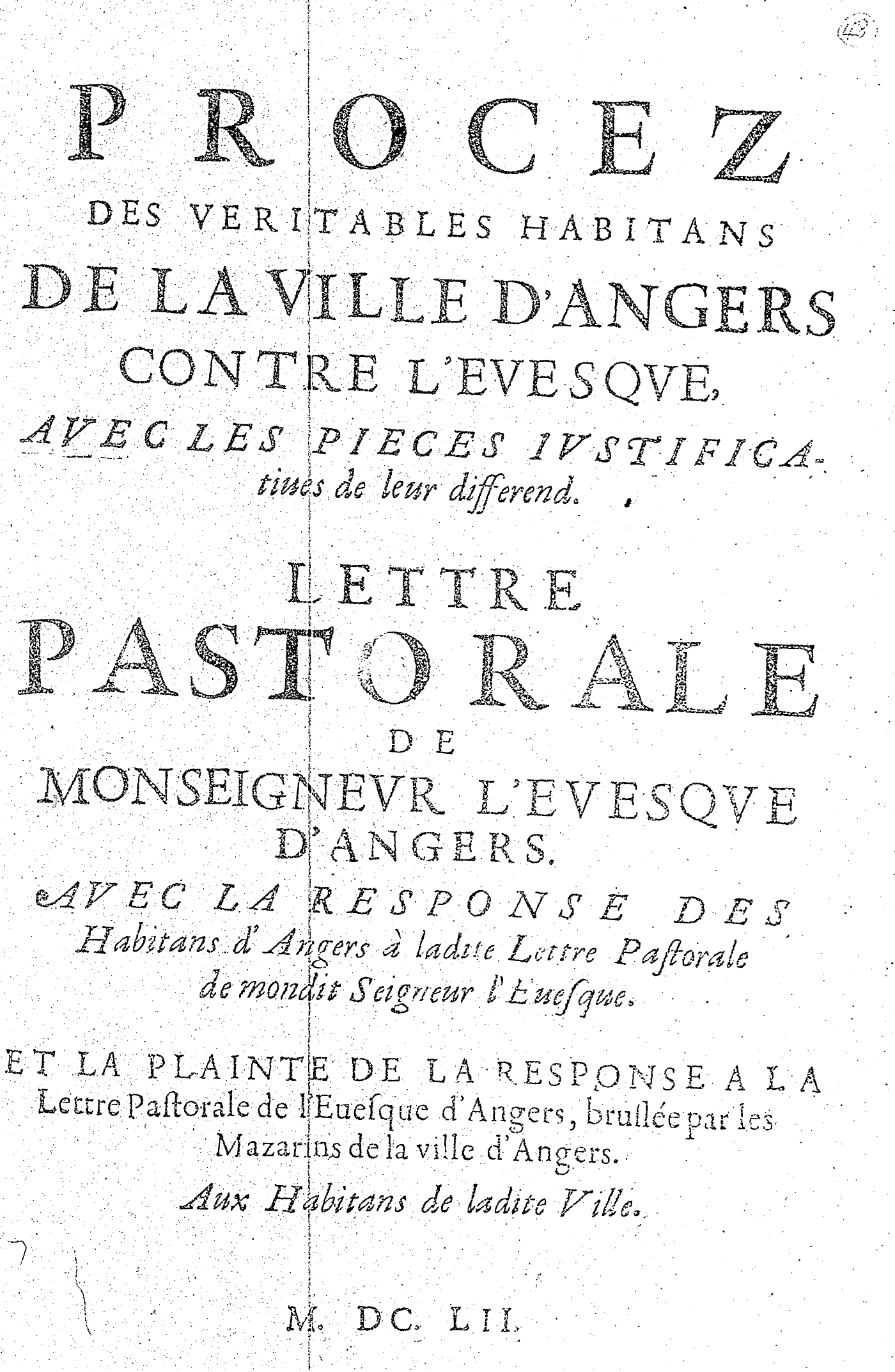 PROCEZ DES VERITABLES HABITANS DE LA VILLE D’ANGERS CONTRE L’EVESQVE, AVEC LES PIECES IVSTIFICATIUES de leur differend. LETTRE PASTORALE DE MONSEIGNEVR L’EVESQVE D’ANGERS. AVEC LA RESPONSE DES Habitans d’Angers à ladite Lettre Pastorale de mondit Seigneur l’Euesque. ET LA PLAINTE DE LA RESPONSE A LA Lettre Pastorale de l’Euesque d’Angers, bruslée par les Mazarins de la ville d’Angers. Aux Habitans de ladite Ville