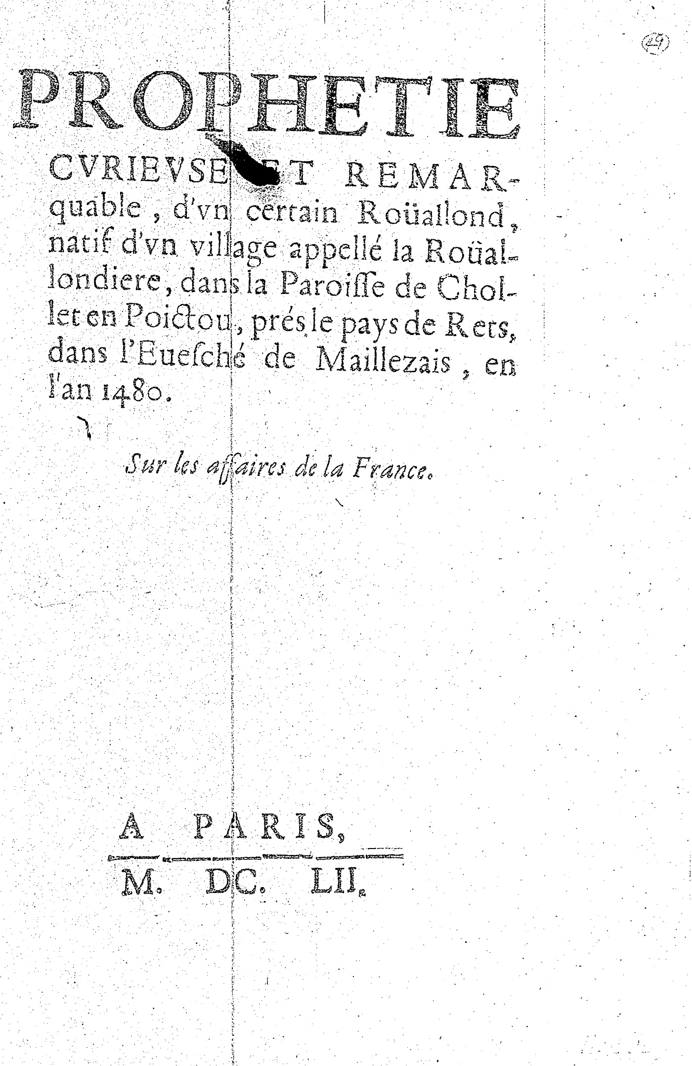 PROPHETIE CVRIEVSE ET REMARQUABLE, d’vn certain Roüallond, natif d’vn village appellé la Roüallondiere, dans la Paroisse de Chollet en Poictou, prés le pays de Rets, dans l’Euesché de Maillezais, en l’an 1480. Sur les affaires de la France.
