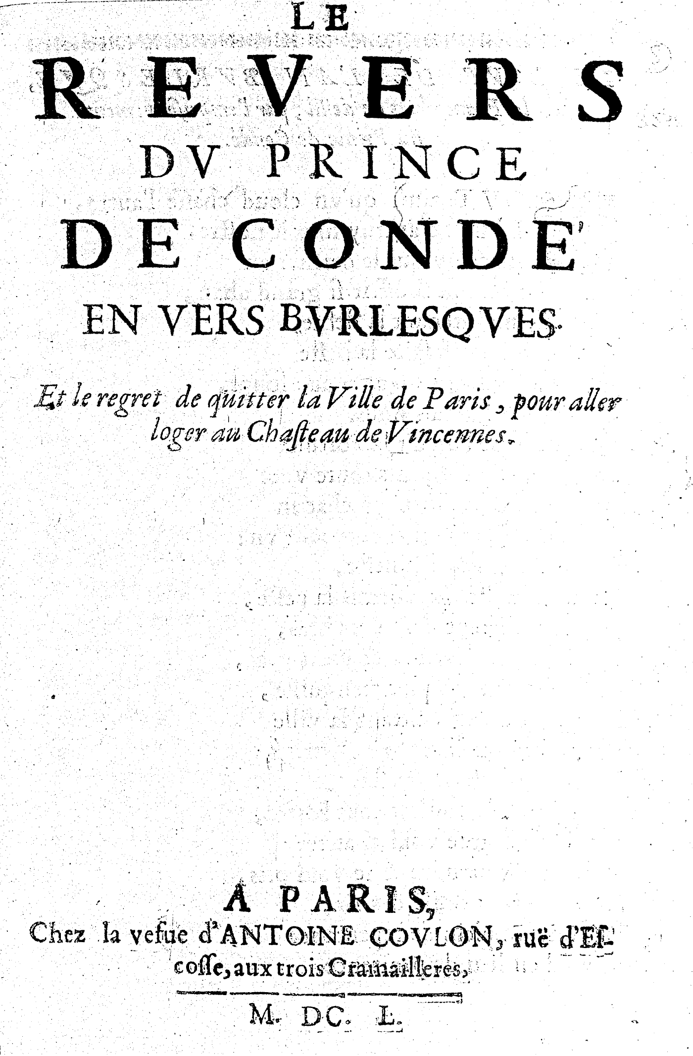 LE REVERS DV PRINCE DE CONDÉ EN VERS BVRLESQVES. Et le regret de quitter la Ville de Paris, pour aller loger au Chasteau de Vincennes.