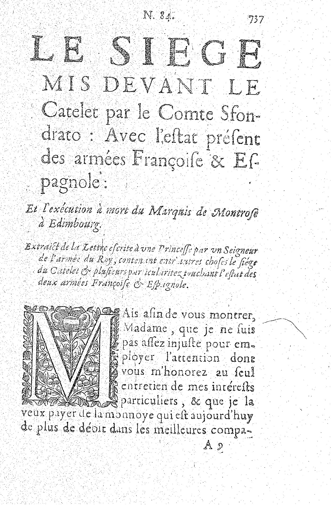 LE SIEGE MIS DEVANT LE Catelet par le Comte Sfondrato : Avec l’estat présent des armées Françoise & Espagnole. Et l’exécution à mort du Marquis de Montrose à Edimbourg.