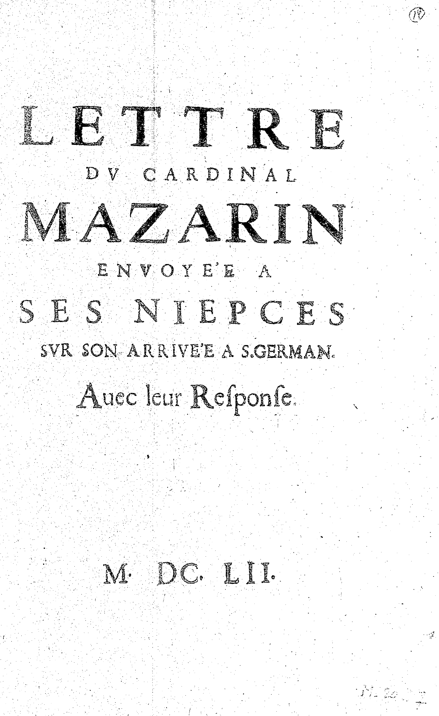 LETTRE DV CARDINAL MAZARIN ENVOYÉE A SES NIEPCES SVR SON ARRIVÉE A S. GERMAN. Auec leur Response.