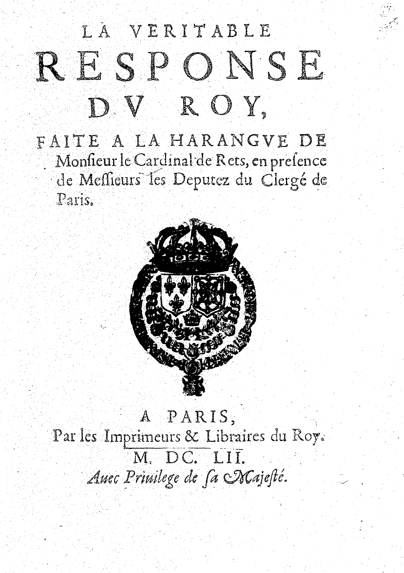 Notice Moreau : Il est clair que ce sont là les éditions officielles et que la Réponse du roi faite aux députés du clergé de Paris, fût-elle exacte, n'aurait pas la même valeur bibliographique. Voir la "Harangue faite au roi par monseigneur le cardinal de Retz" [M0_1594], etc., et la "Véritable harangue" [M0_3937], etc.