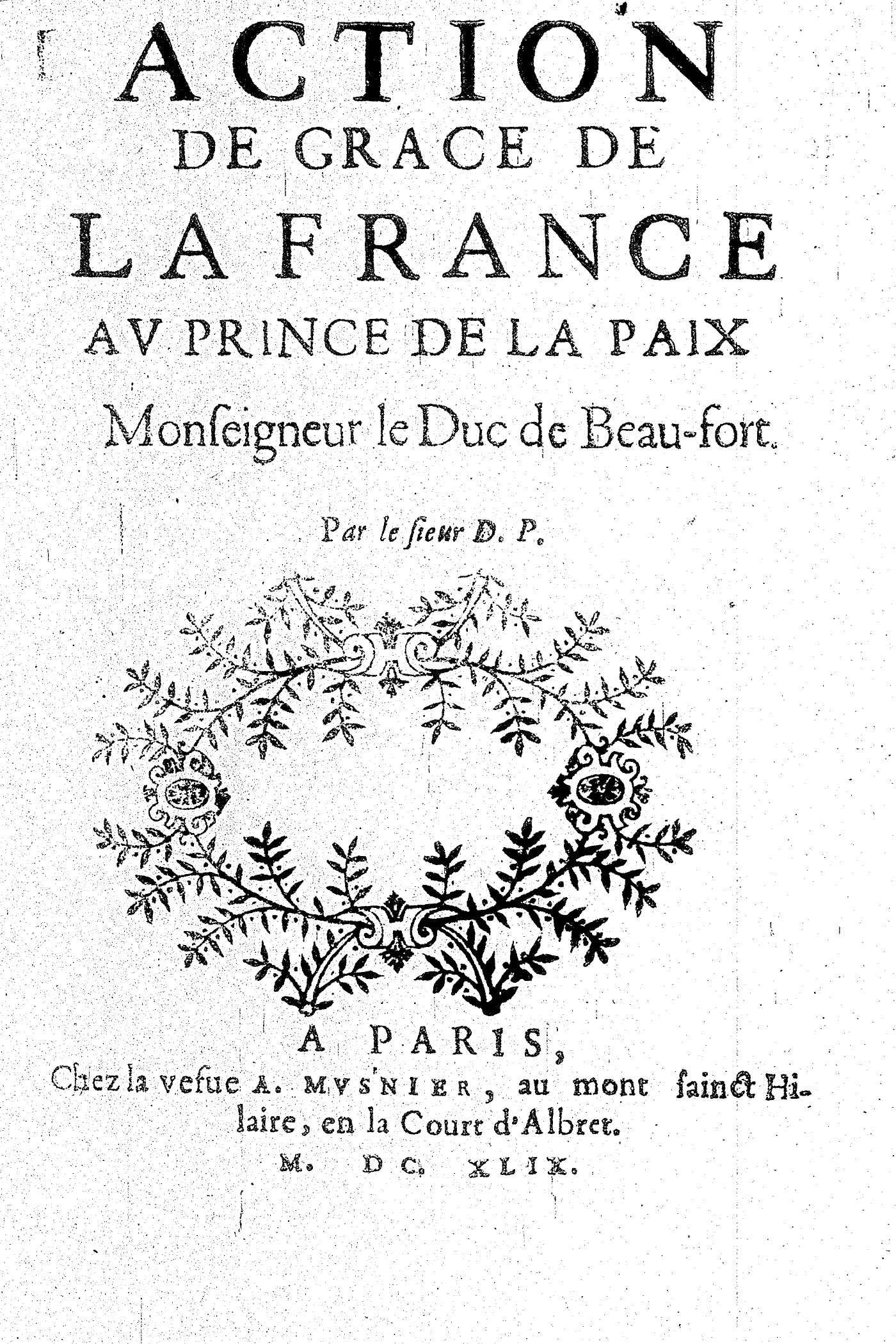 ACTION DE GRACE DE LA FRANCE AV PRINCE DE LA PAIX Monseigneur le Duc de Beau-fort. Par le sieur D. P.