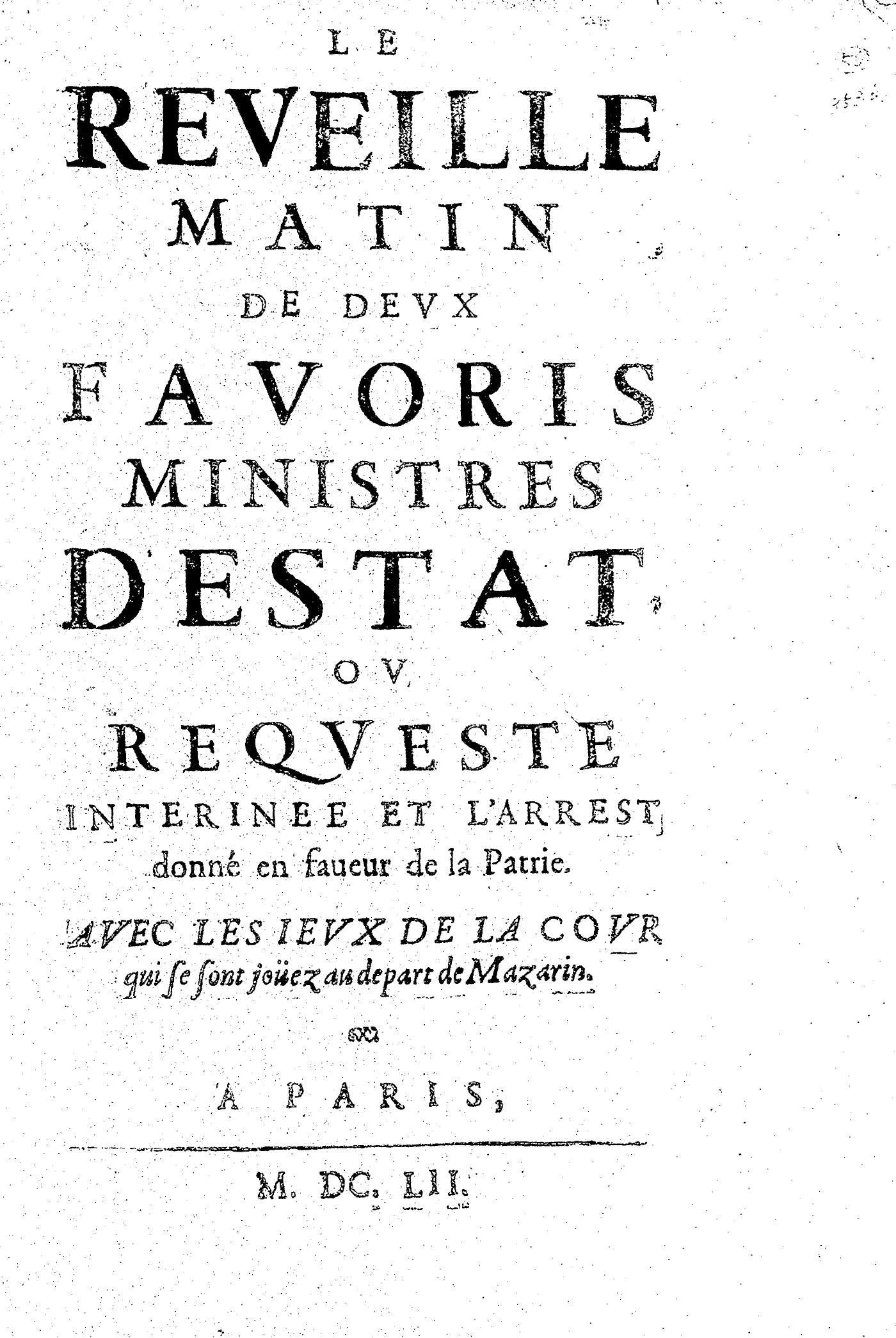LE REVEILLE MATIN DE DEVX FAVORIS MINISTRES D’ESTAT, OV REQVESTE INTERINEE ET L’ARREST donné en faueur de la Partie. AVEC LES IEVX DE LA COVR qui se sont joüez au depart de Mazarin.