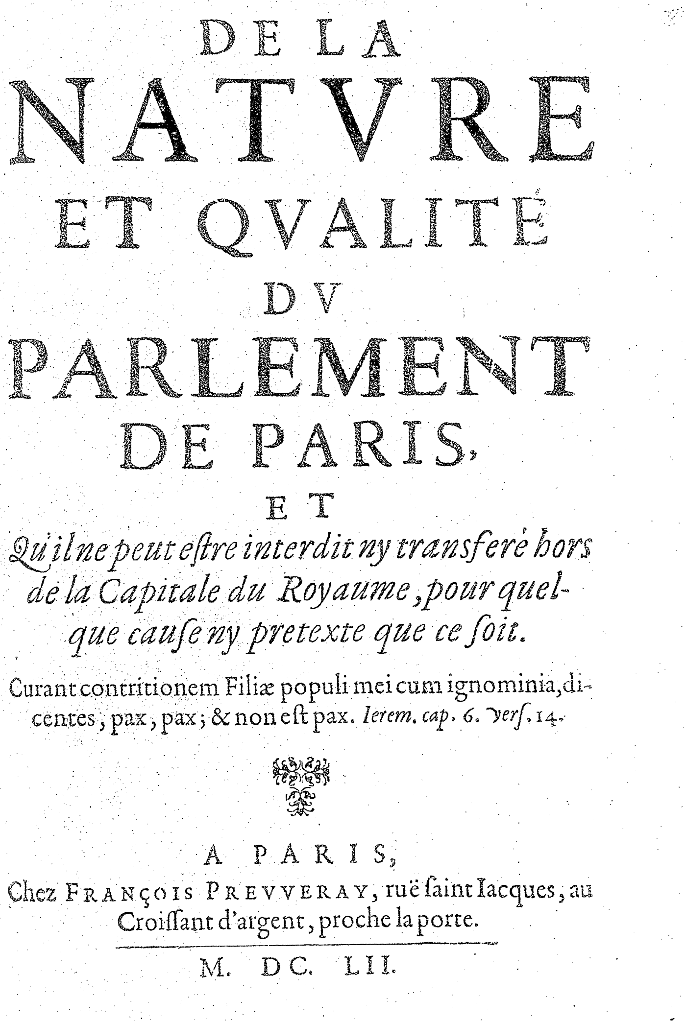 DE LA NATVRE ET QVALITÉ DV PARLEMENT DE PARIS, ET Qu’il ne peut estre interdit ny transferé hors de la Capitale du Royaume, pour quelque cause ny pretexte que ce soit.