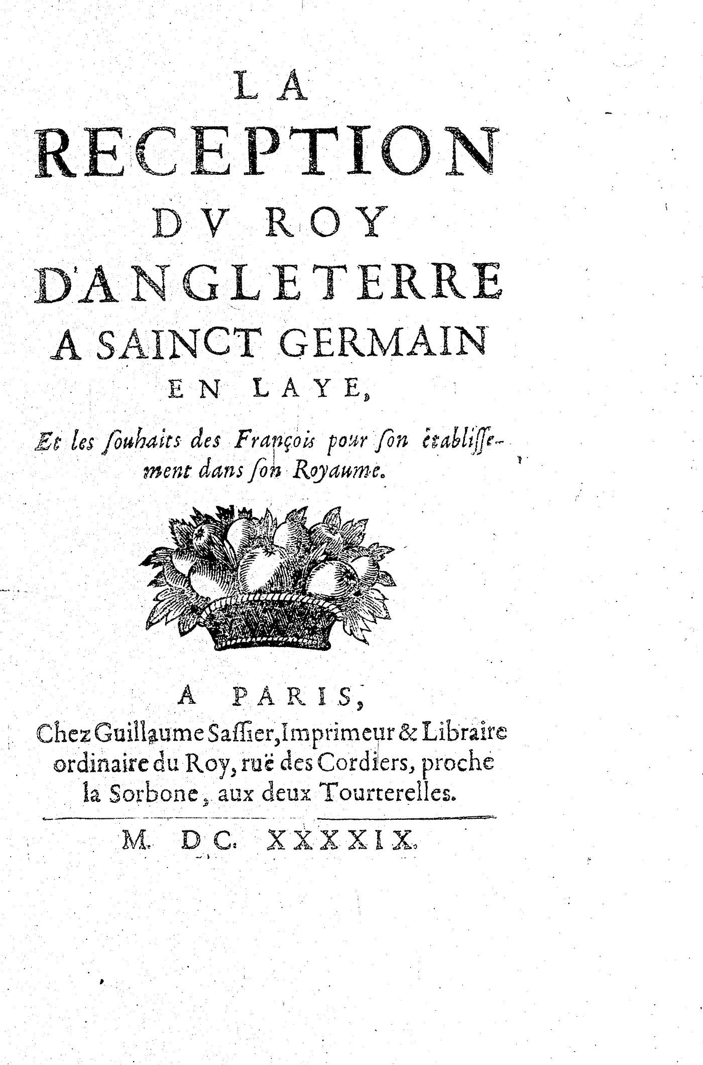LA RECEPTION DV ROY D’ANGLETERRE A SAINCT GERMAIN EN LAYE, Et les souhaits des François pour son établissement dans son Royaume.