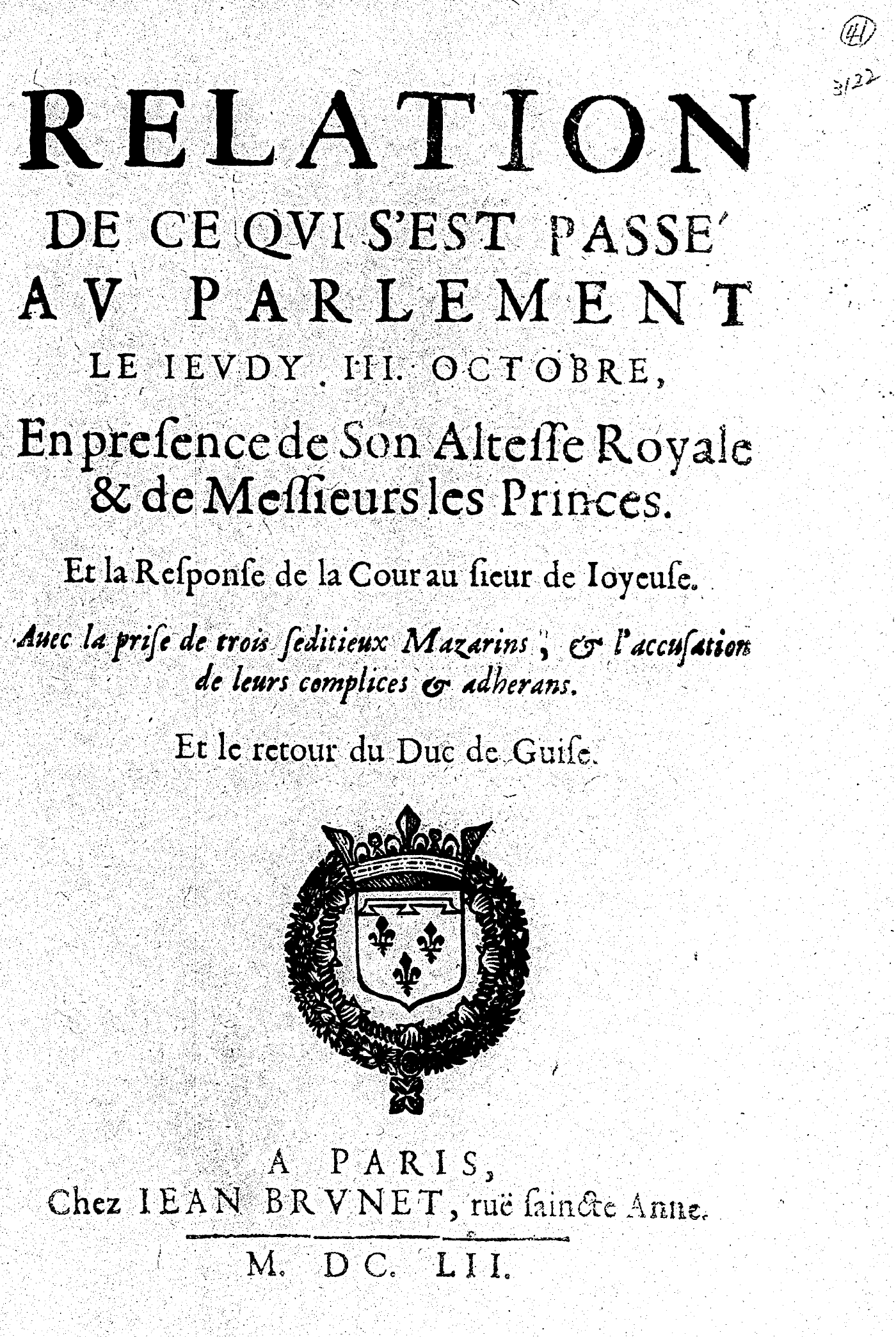 RELATION DE CE QVI S’EST PASSÉ AV PARLEMENT LE IEVDY III. OCTOBRE, En presence de Son Altesse Royale & de Messieurs les Princes. Et la Response de la Cour au sieur de Ioyeuse. Auec la prise de trois seditieux Mazarins, & l’accusation de leurs complices & adherans. Et le retour du Duc de Guise.