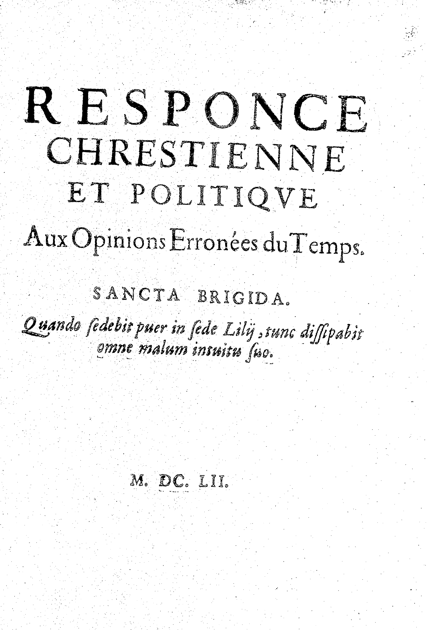 RESPONCE CHRESTIENNE ET POLITIQVE Aux Opinions Erronées du Temps. SANCTA BRIGIDA. Quando sedebit puer in sede Lilij, tunc dissipabit omne malum intuitu suo.