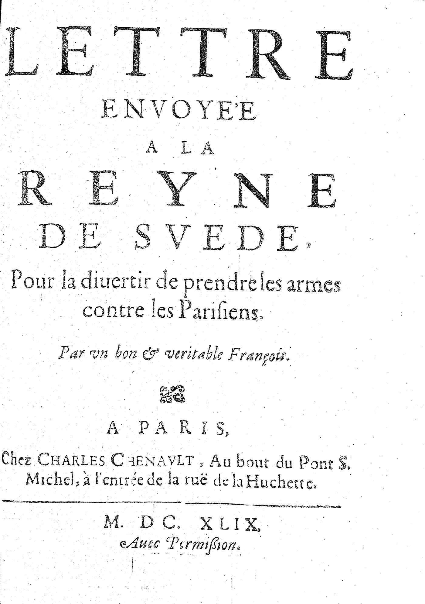 LETTRE ENVOYÉE A LA REYNE DE SVEDE, Pour la diuertir de prendre les armes contre les Parisiens. Par vn bon & veritable François.