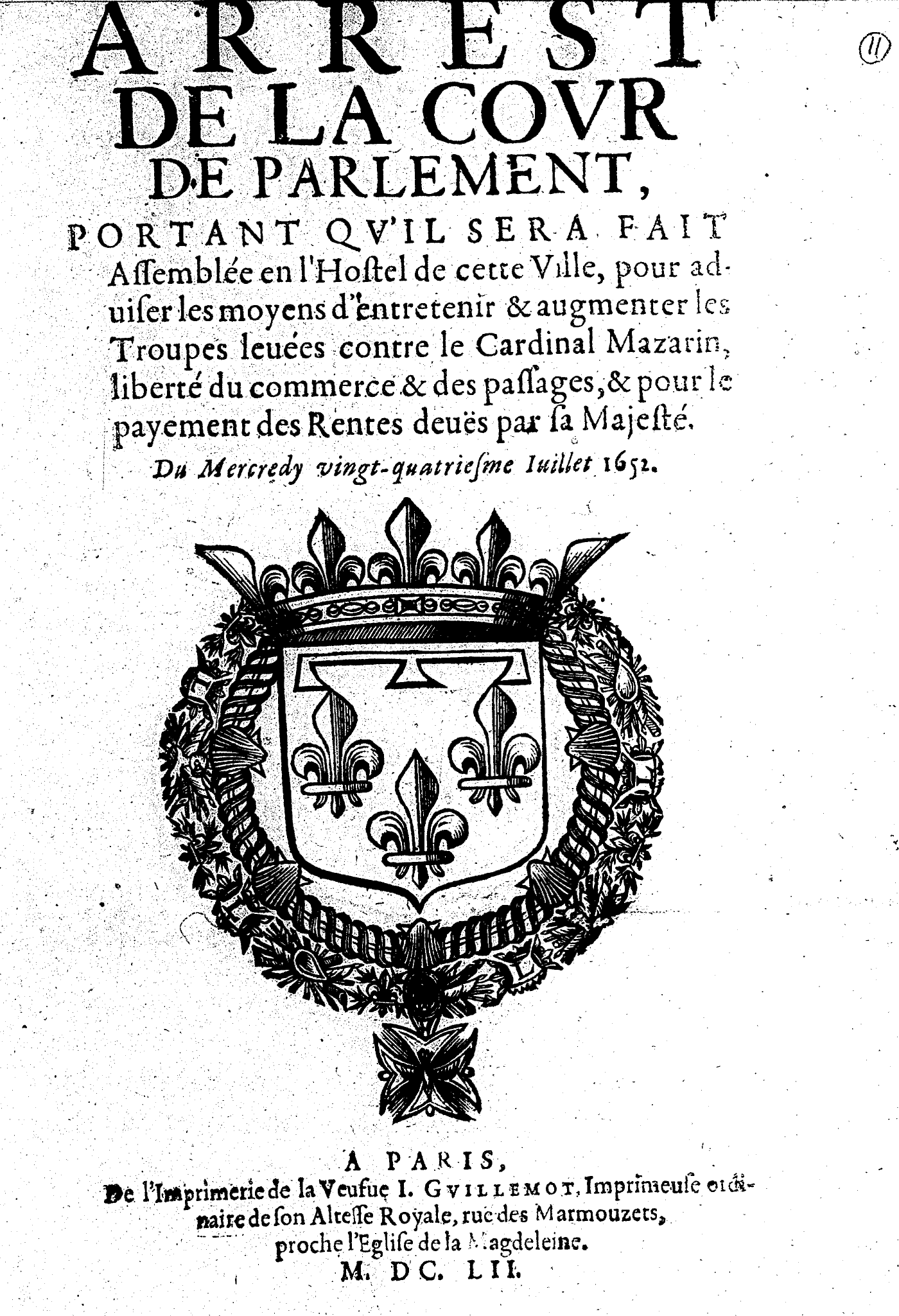 ARREST DE LA COVR DE PARLEMENT, PORTANT QV’IL SERA FAIT Assemblée en l’Hostel de cette Ville, pour aduiser les moyens d’éntretenir & augmenter les Troupes leuées contre le Cardinal Mazarin, liberté du commerce & des passages, & pour le payement des Rentes deuës par sa Majesté.