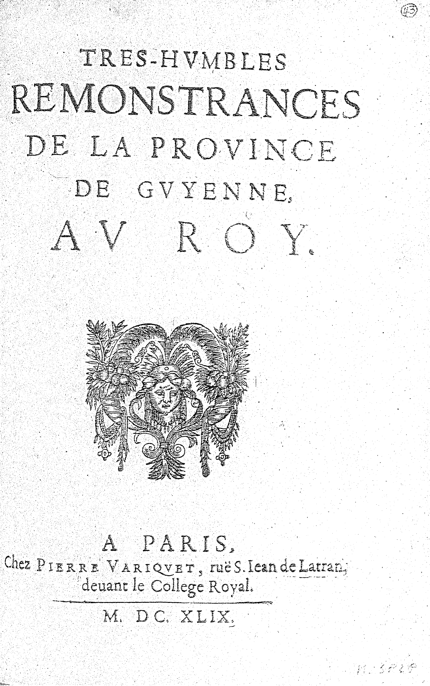TRES-HVMBLES REMONSTRANCES DE LA PROVINCE DE GVYENNE, AV ROY.