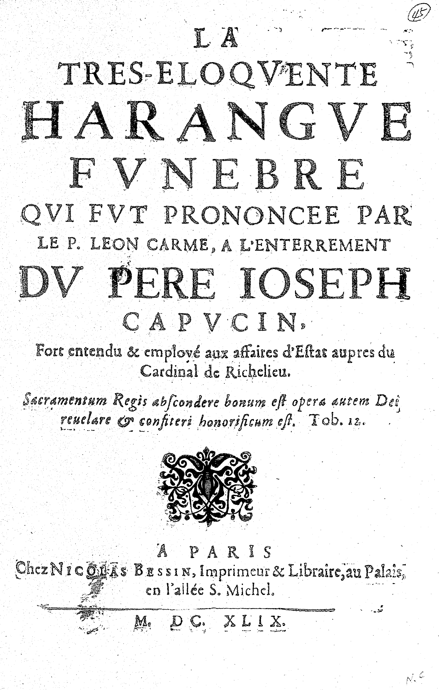LA TRES-ELOQVENTE HARANGVE FVNEBRE QVI FVT PRONONCEE PAR LE P. LEON CARME, A L’ENTERREMENT DV PERE IOSEPH CAPVCIN, Fort entendu & employé aux affaires d’Estat aupres du Cardinal de Richelieu. Sacramentum Regis abscondere bonum est opera autem Dei reuelare & confiteri honorificum est.