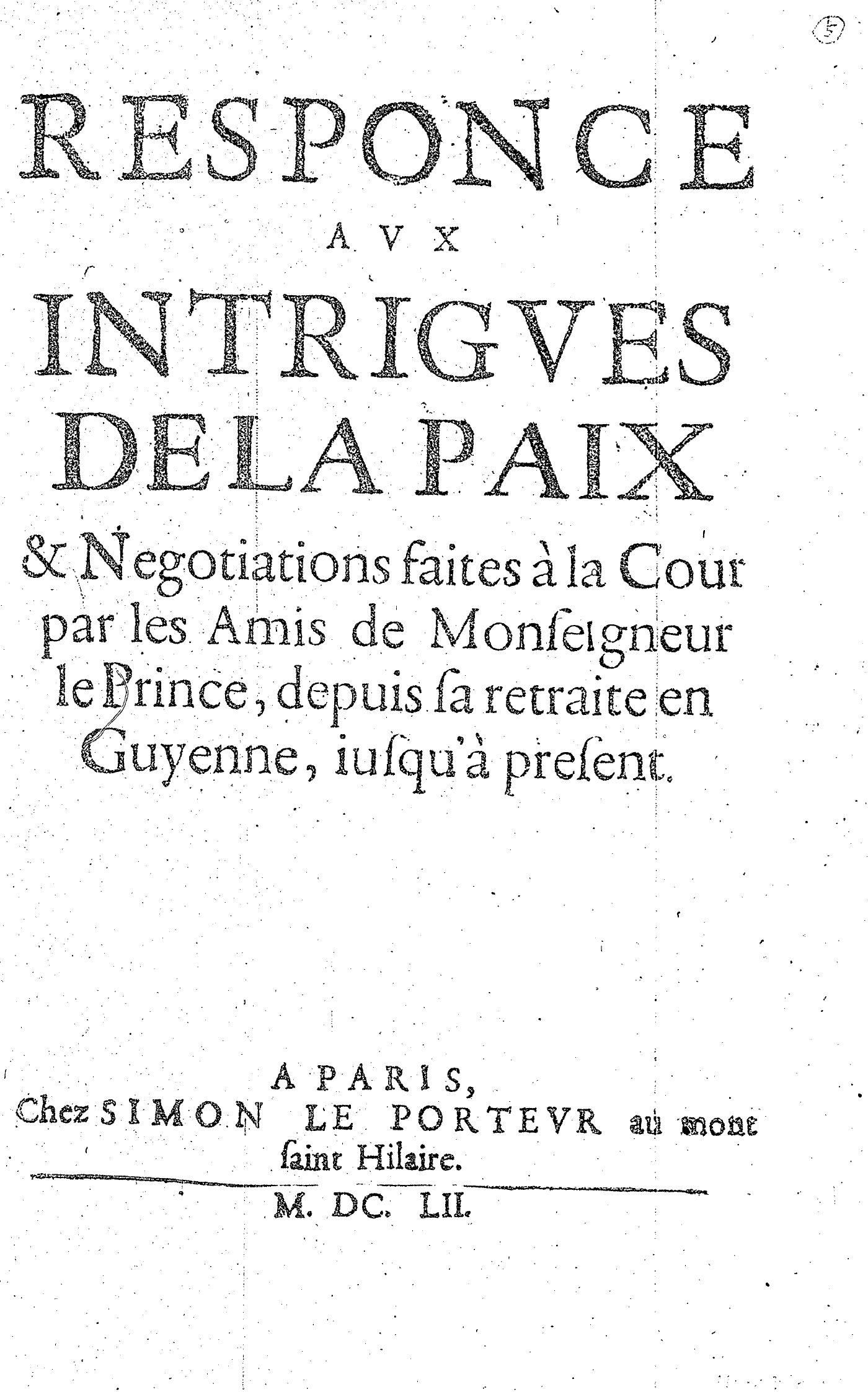 RESPONCE AVX INTRIGVES DE LA PAIX & Negotiations faites à la Cour par les Amis de Monseigneur le Prince, depuis sa retraite en Guyenne, iusqu’à present.