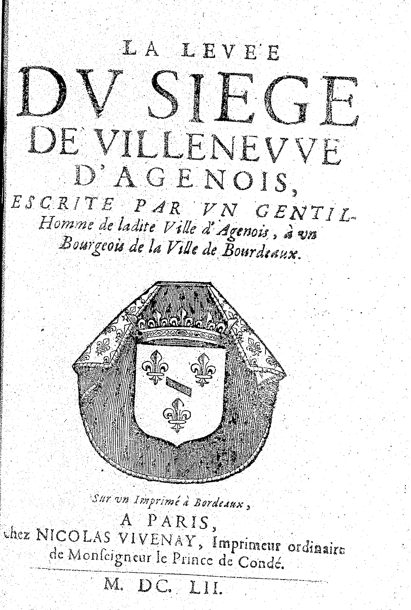 LA LEVÉE DV SIEGE DE VILLENEVVE D’AGENOIS, ESCRITE PAR VN GENTILHOMME de ladite Ville d’Agenois, à vn Bourgeois de la Ville de Bourdeaux.