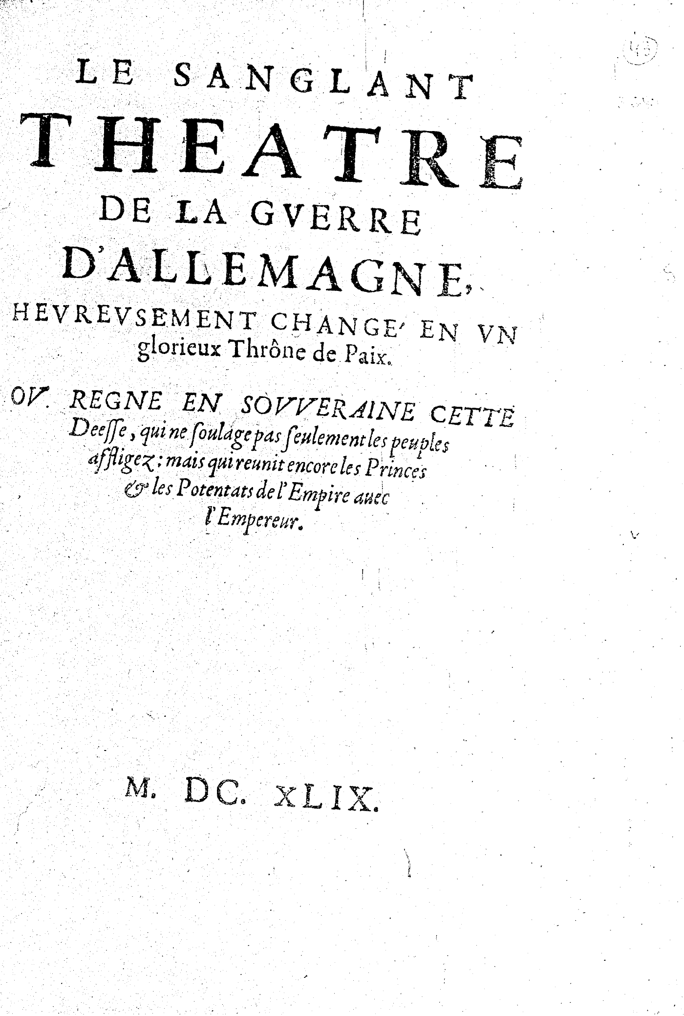 LE SANGLANT THEATRE DE LA GVERRE D’ALLEMAGNE, HEVREVSEMENT CHANGÉ EN VN glorieux Thrône de Paix. OV REGNE EN SOVVERAINE CETTE Deesse, qui ne soulage pas seulement les peuples affligez : mais qui reunit encore les Princes & les Potentats de l’Empire auec l’Empereur.