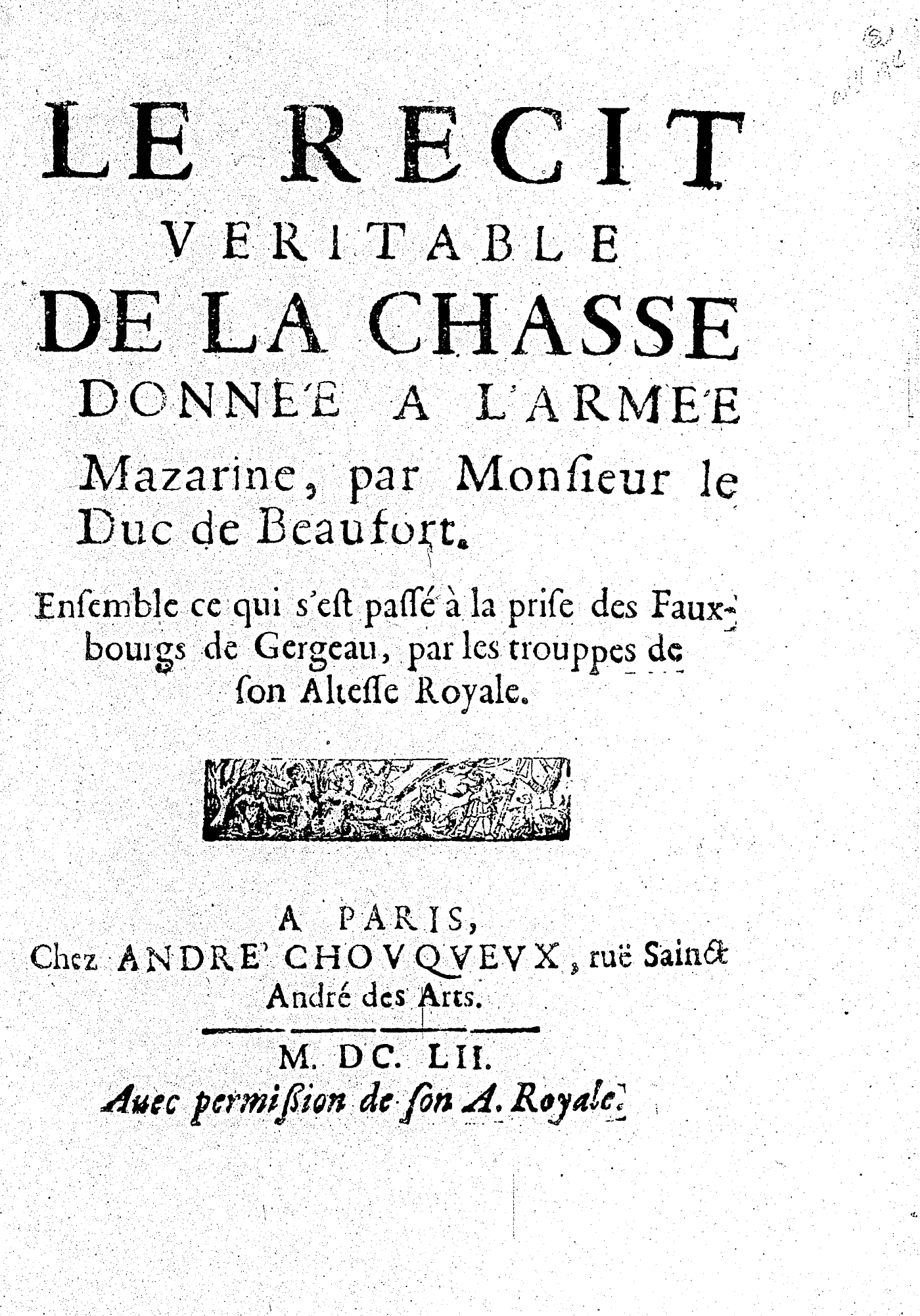 LE RECIT VERITABLE DE LA CHASSE DONNÉE A L’ARMÉE Mazarine, par Monsieur le Duc de Beaufort. Ensemble ce qui s’est passé à la prise des Fauxbourgs de Gergeau, par les trouppes de son Altesse Royale.