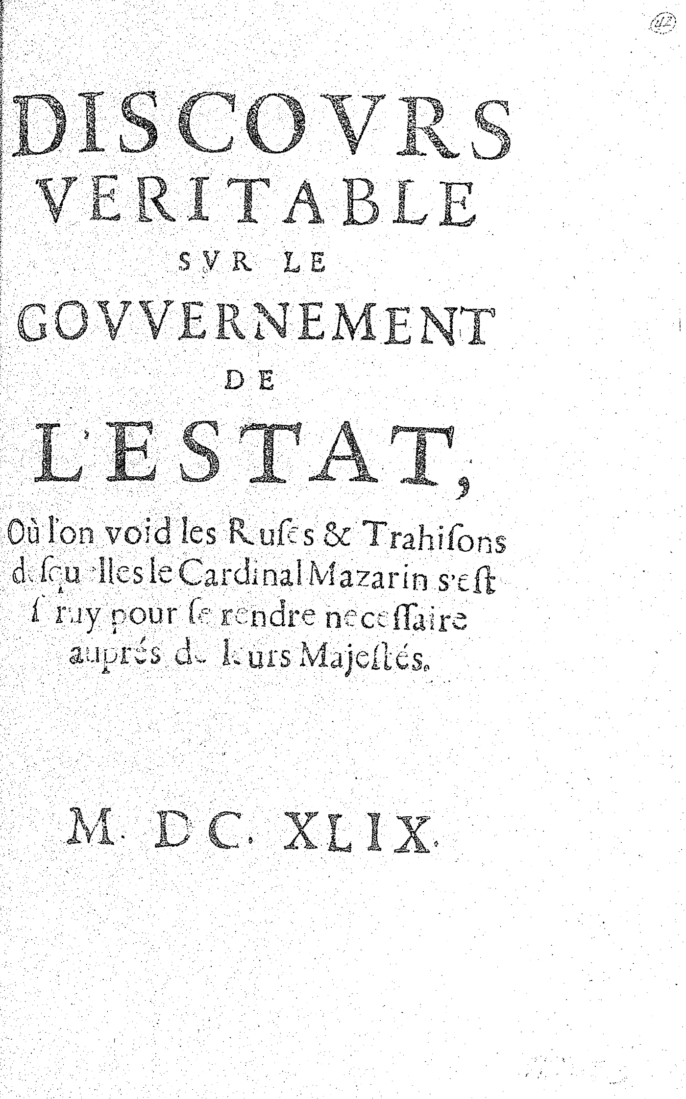 DISCOVRS VERITABLE SVR LE GOVVERNEMENT DE L’ESTAT, Où l’on void les Ruses & Trahisons desquelles le Cardinal Mazarin s’est seruy pour se rendre necessaire auprés de leurs Majestés.