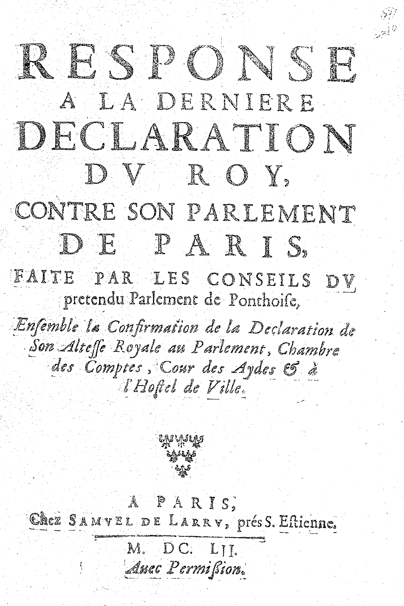 RESPONSE A LA DERNIERE DECLARATION DV ROY, CONTRE SON PARLEMENT DE PARIS, FAITE PAR LES CONSEILS DV pretendu Parlement de Ponthoise, Ensemble la Confirmation de la Declaration de Son Altesse Royale au Parlement, Chambre des Comptes, Cour des Aydes & à l’Hostel de Ville.