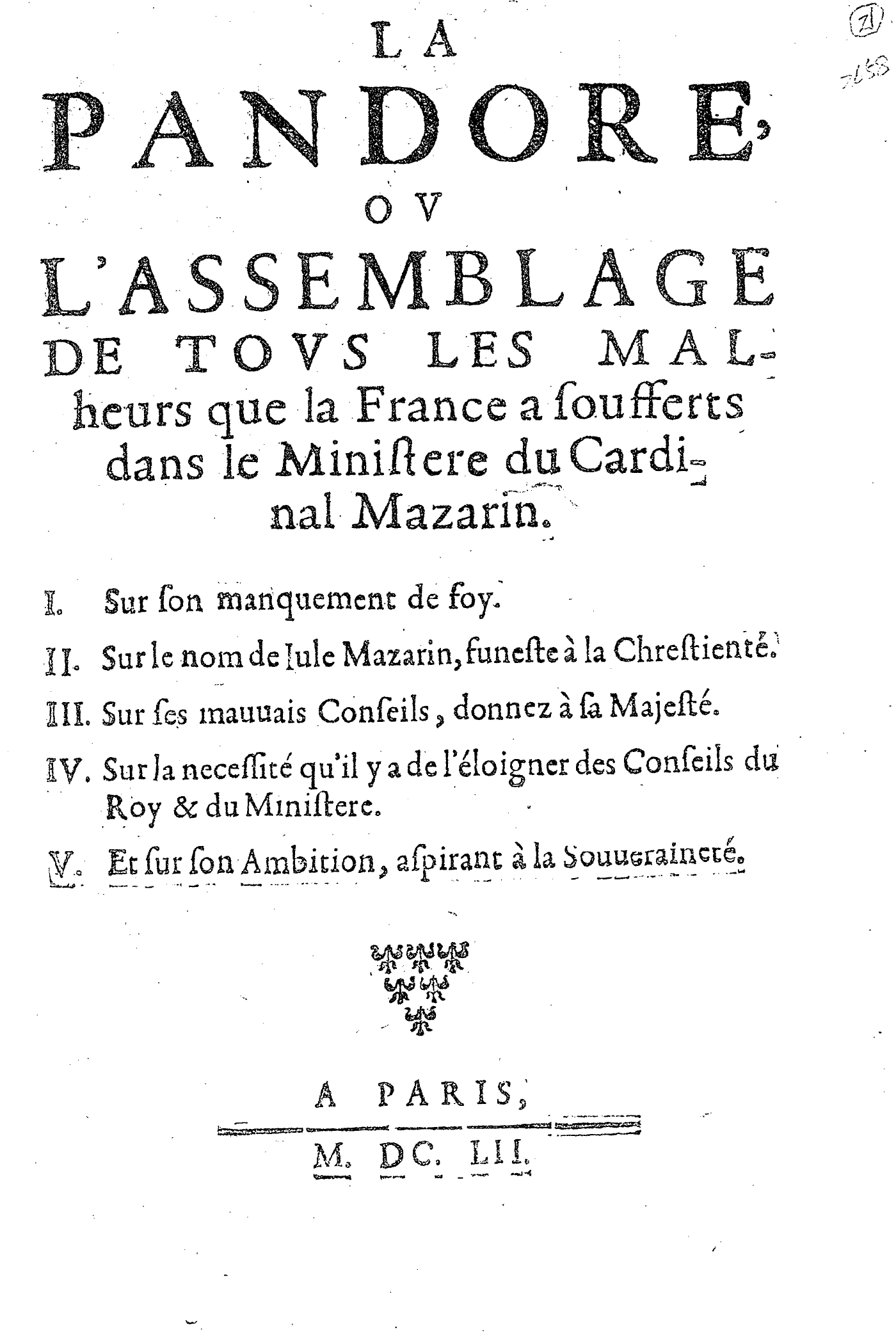 LA PANDORE, OV L’ASSEMBLAGE DE TOVS LES MALHEURS que la France a soufferts dans le Ministere du Cardinal Mazarin. I. Sur son manquement de foy. II. Sur le nom de Iule Mazarin, funeste à la Chrestienté. III. Sur ses mauuais Conseils, donnez à sa Majesté. IV. Sur la necessité qu’il y a de l’éloigner des Conseils du Roy & du Ministere. V. Et sur son Ambition, aspirant à la Souueraineté.