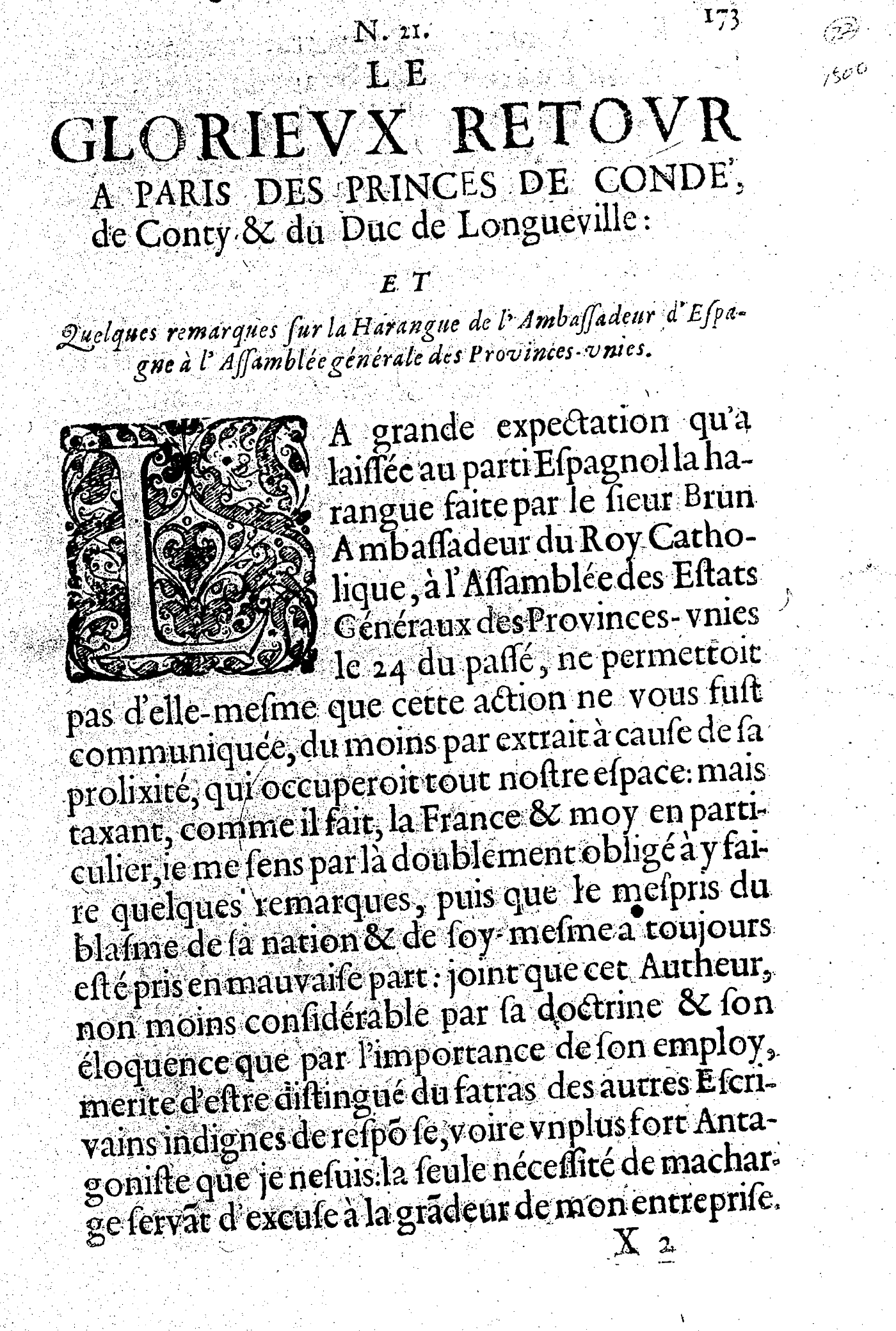Sans page de titre. Paginée de 173 à 184, avec mention "N. 21" en surtitre. Informations éditoriales au colophon : "à Paris, au Bureau d'Adresse, aux Galeries du Louvre" (fondé par Théophraste Renaudot)... le 17 février 1651. Avec privilège.