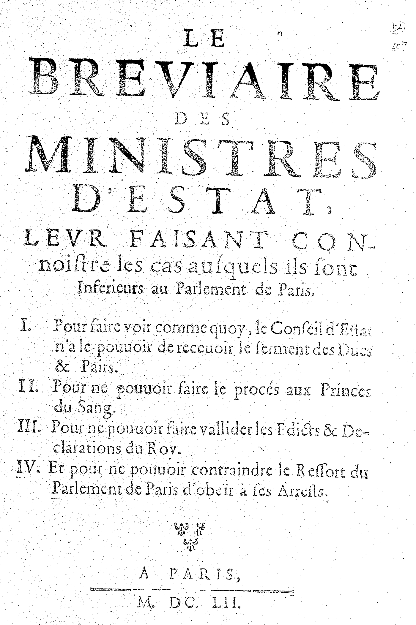 LE BREVIAIRE DES MINISTRES D’ESTAT, LEVR FAISANT CONNOISTRE les cas ausquels ils sont Inferieurs au Parlement de Paris. I. Pour faire voir comme quoy, le Conseil d’Estat n’a le pouuoir de receuoir le serment des Ducs & Pairs. II. Pour ne pouuoir faire le procés aux Princes du Sang. III. Pour ne pouuoir faire vallider les Edicts & Declarations du Roy. IV. Et pour ne pouuoir contraindre le Ressort du Parlement de Paris d’obeïr à ses Arrests.