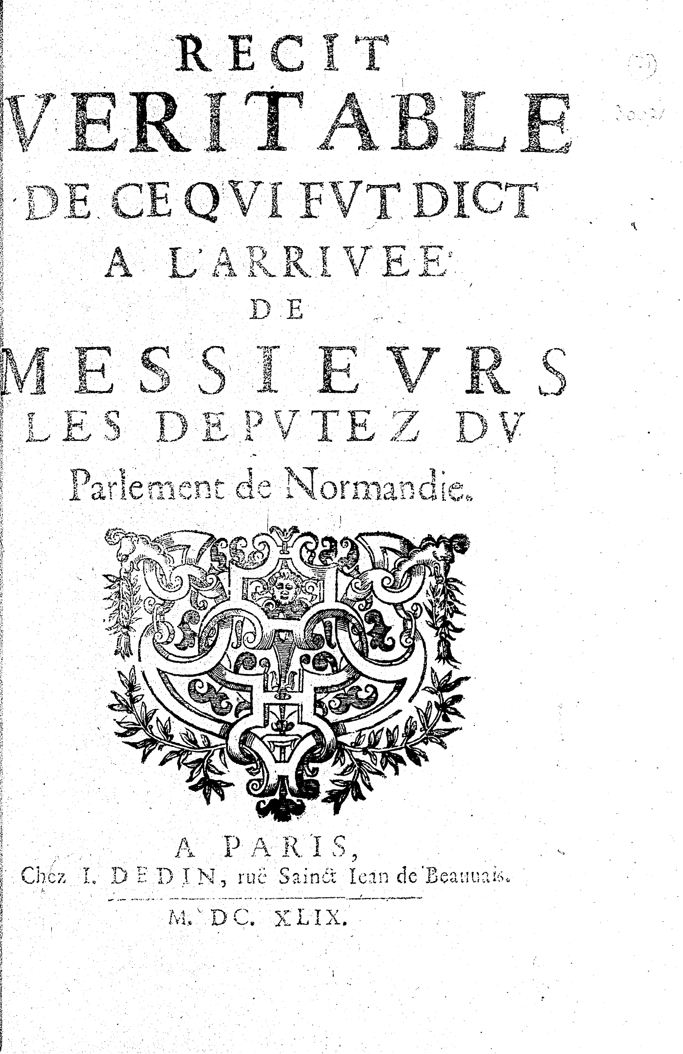 RECIT VERITABLE DE CE QVI FVT DICT A L’ARRIVEÉ DE MESSIEVRS LES DEPVTEZ DV Parlement de Normandie.