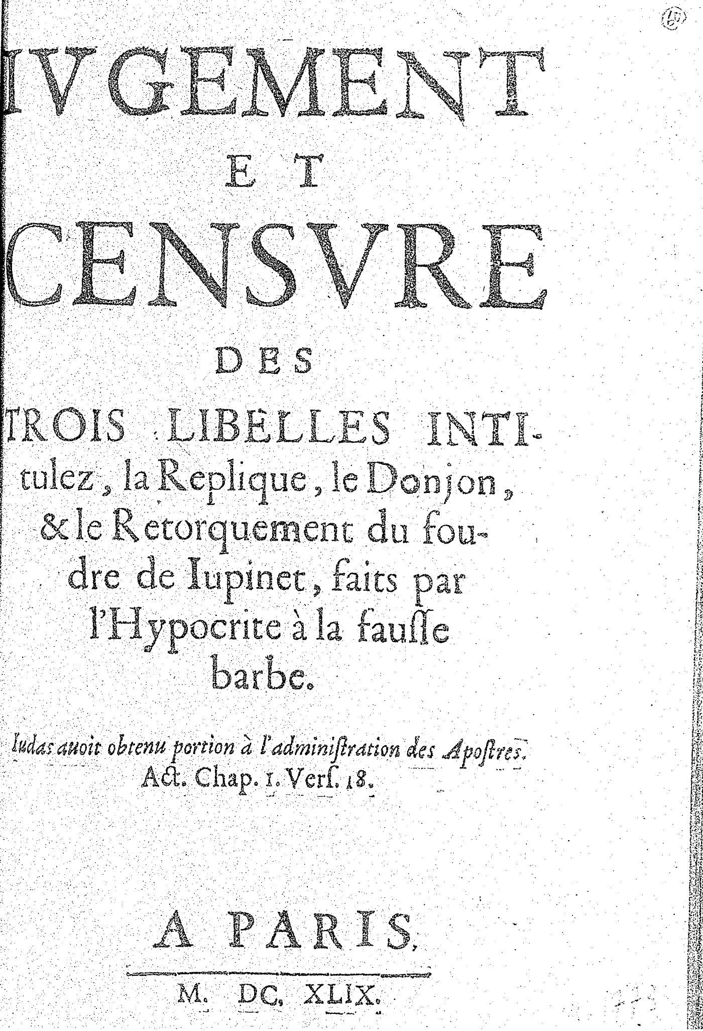 IVGEMENT ET CENSVRE DES TROIS LIBELLES INTITULEZ, la Replique, le Donjon, & le Retorquement du foudre de Iupinet, faits par l’Hypocrite à la fausse barbe. Iudas auoit obtenu portion à l’administration des Apostres. Act. Chap. 1. Vers. 18.