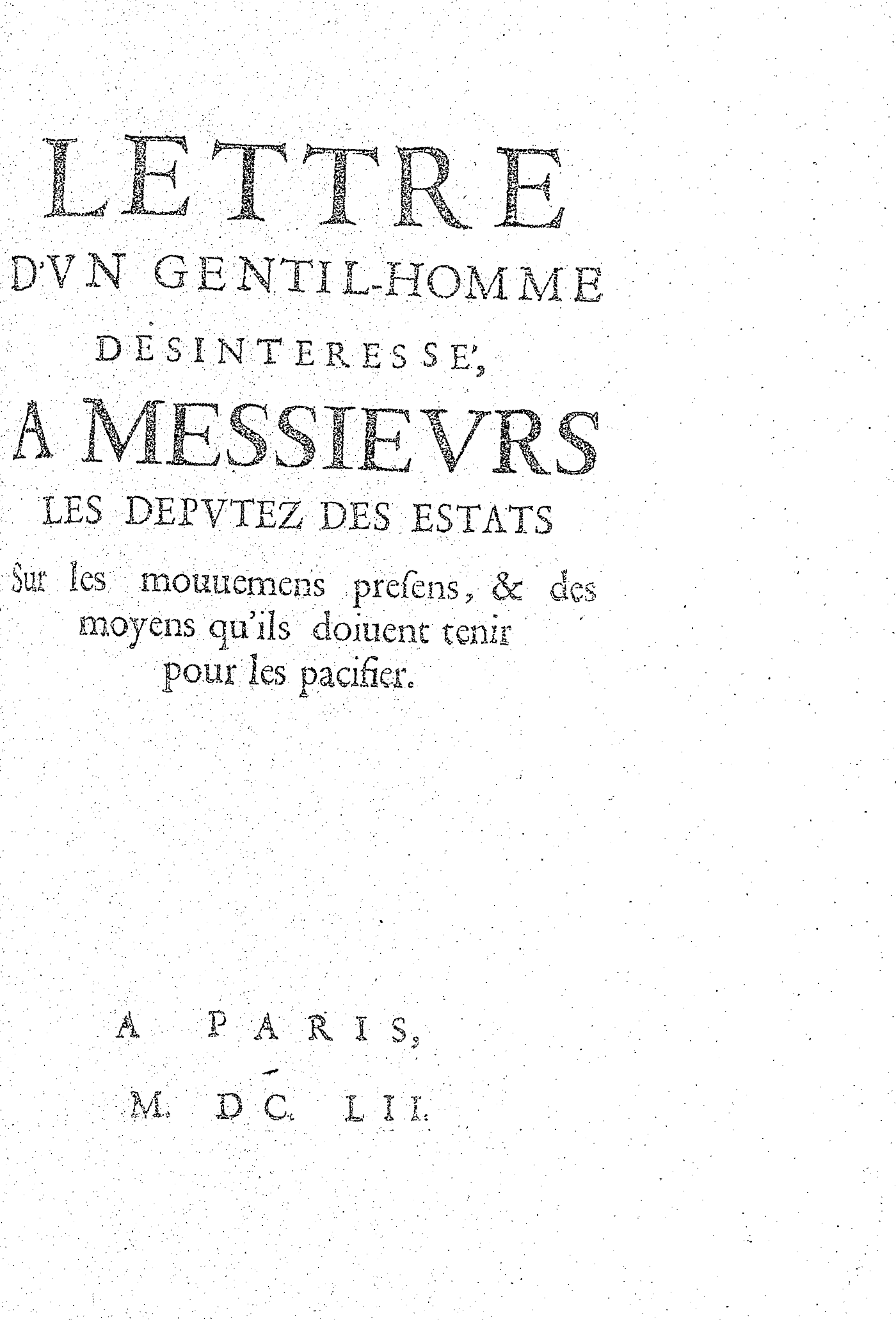 LETTRE D’VN GENTIL-HOMME DESINTERESSÉ, A MESSIEVRS LES DEPVTEZ DES ESTATS Sur les mouuemens presens, & des moyens qu’ils doiuent tenir pour les pacifier.