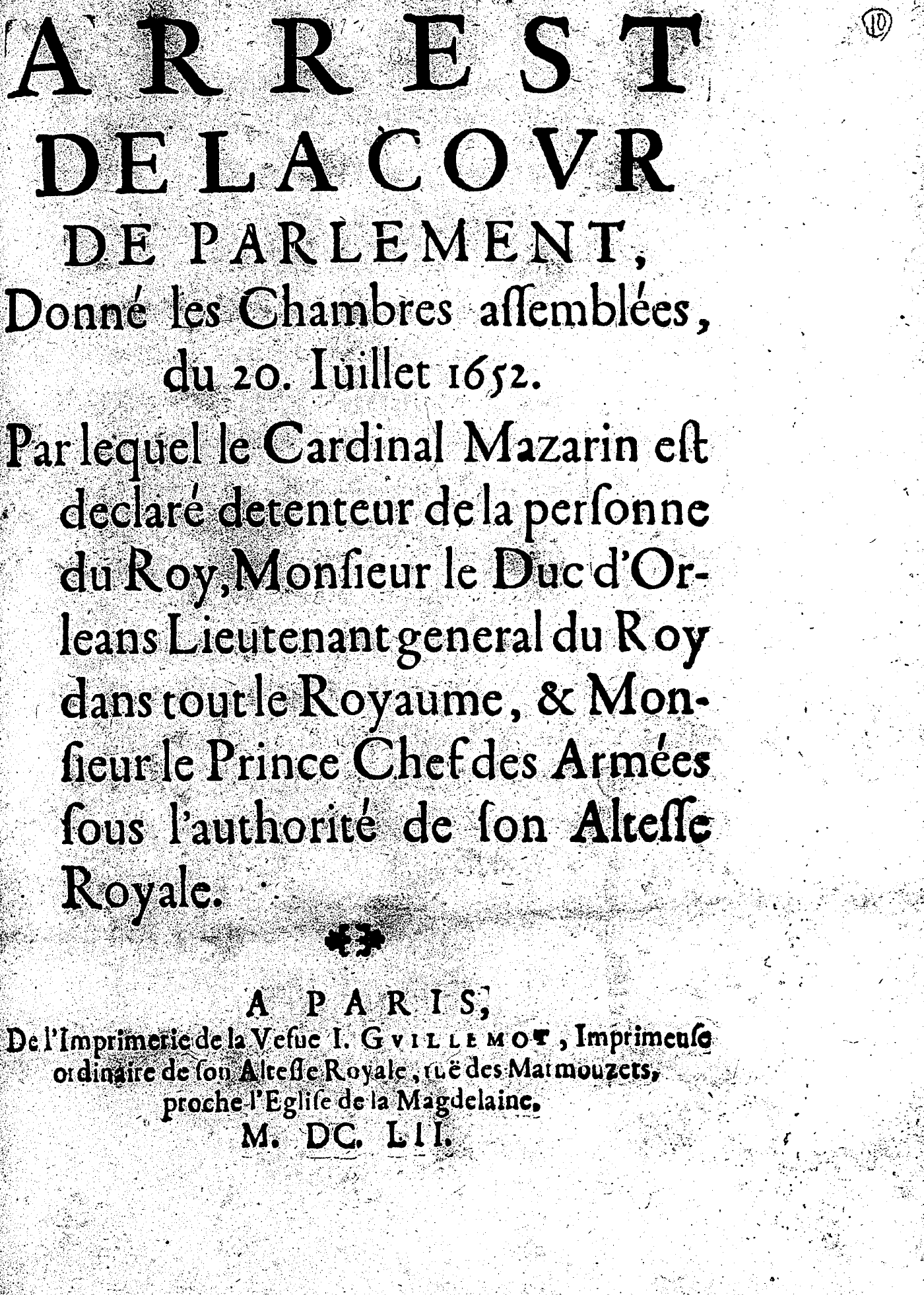 ARREST DE LA COVR DE PARLEMENT, Donné les Chambres assemblées, du 20. Iuillet 1652. Par lequel le Cardinal Mazarin est declaré detenteur de la personne du Roy, Monsieur le Duc d’Orleans Lieutenant general du Roy dans tout le Royaume, & Monsieur le Prince Chef des Armées sous l’authorité de son Altesse Royale.