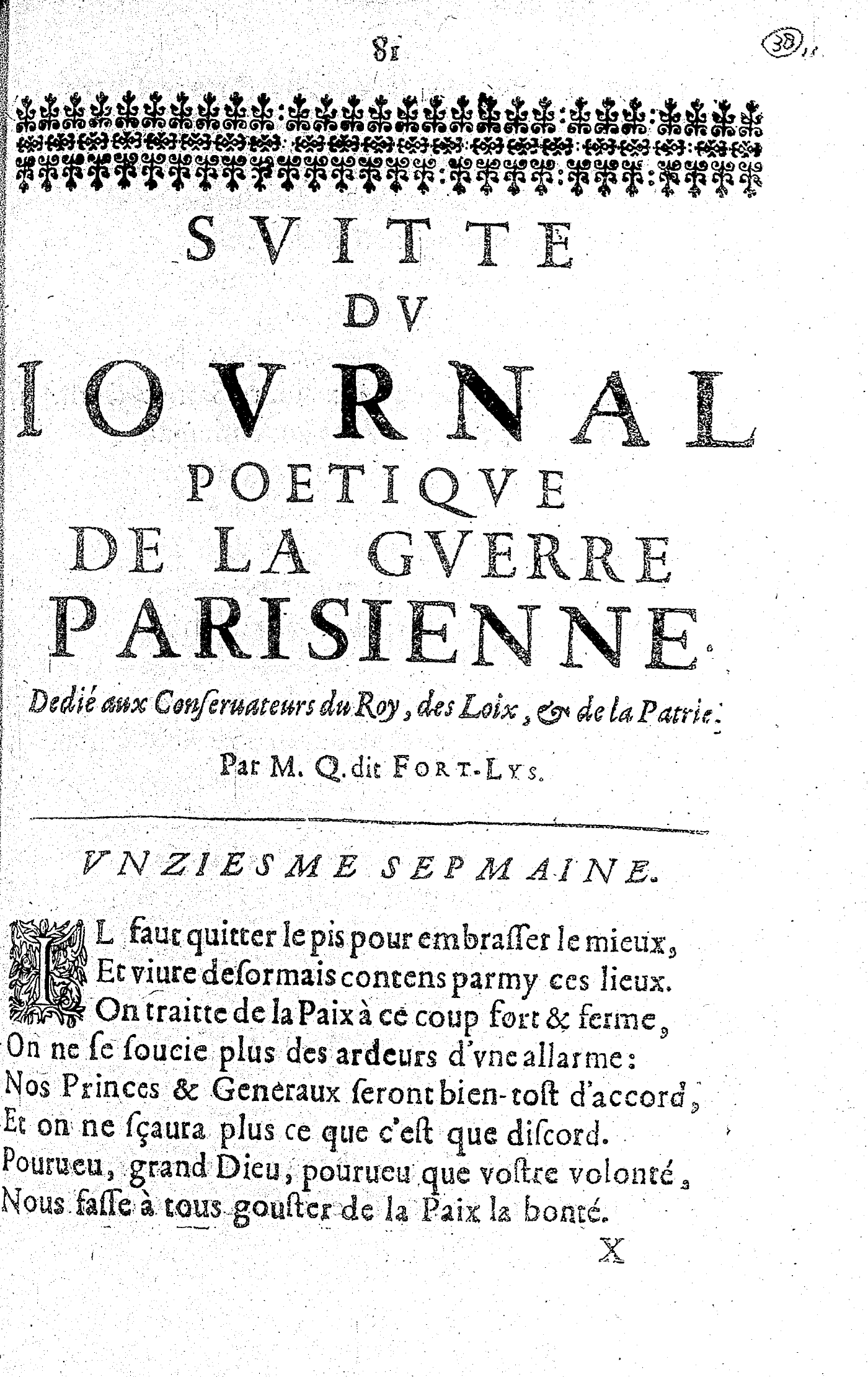 SVITTE DV IOVRNAL POETIQVE DE LA GVERRE PARISIENNE. Dedié aux Conseruateurs du Roy, des Loix, & de la Patrie. Par M. Q. dit FORT-LYS. VNZIESME SEPMAINE.