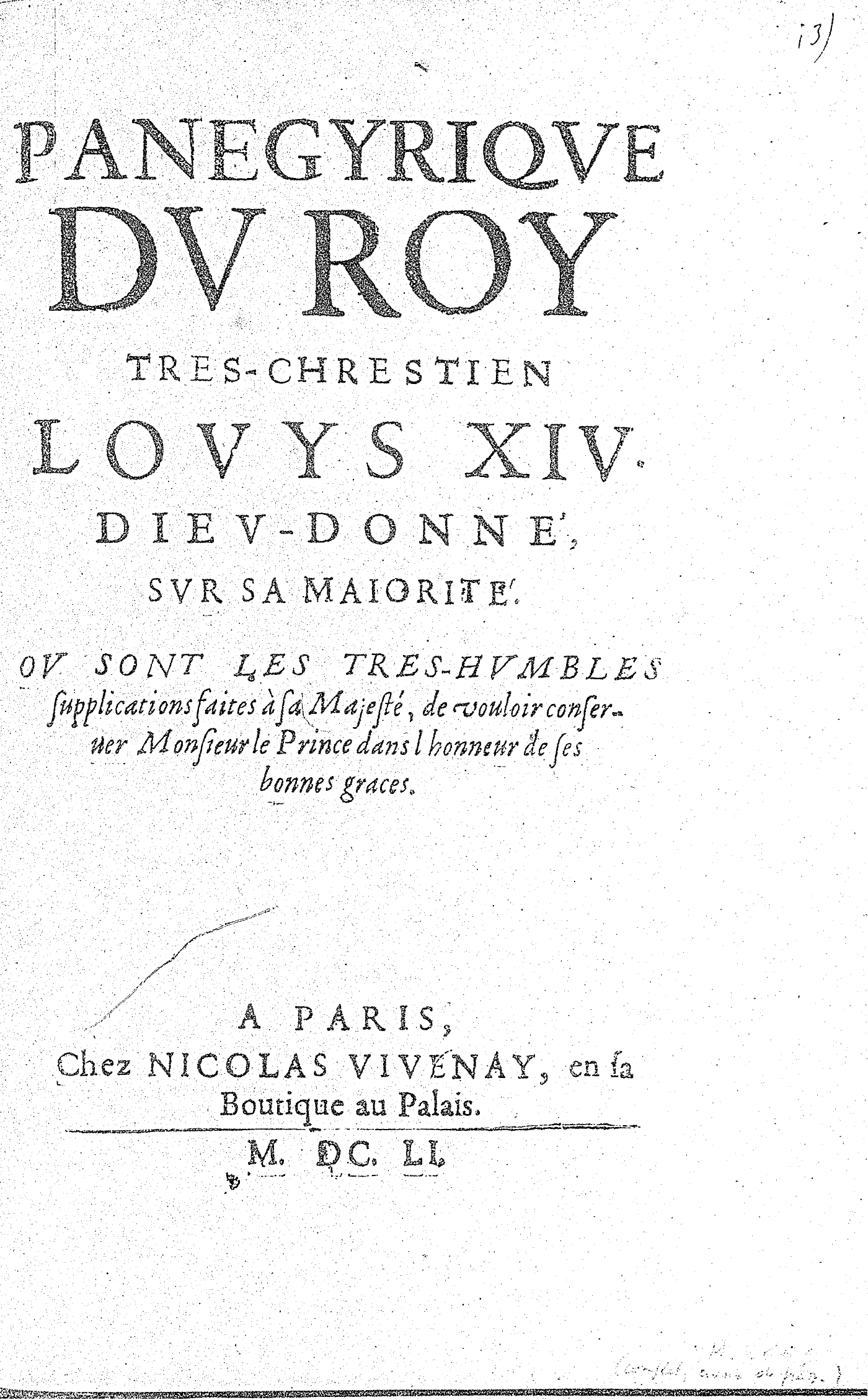 PANEGYRIQVE DV ROY TRES-CHRESTIEN LOVYS XIV. DIEV-DONNÉ, SVR SA MAIORITÉ. OV SONT LES TRES-HVMBLES supplications faites à sa Majesté, de vouloir conseruer Monsieur le Prince dans l’honneur de ses bonnes graces.