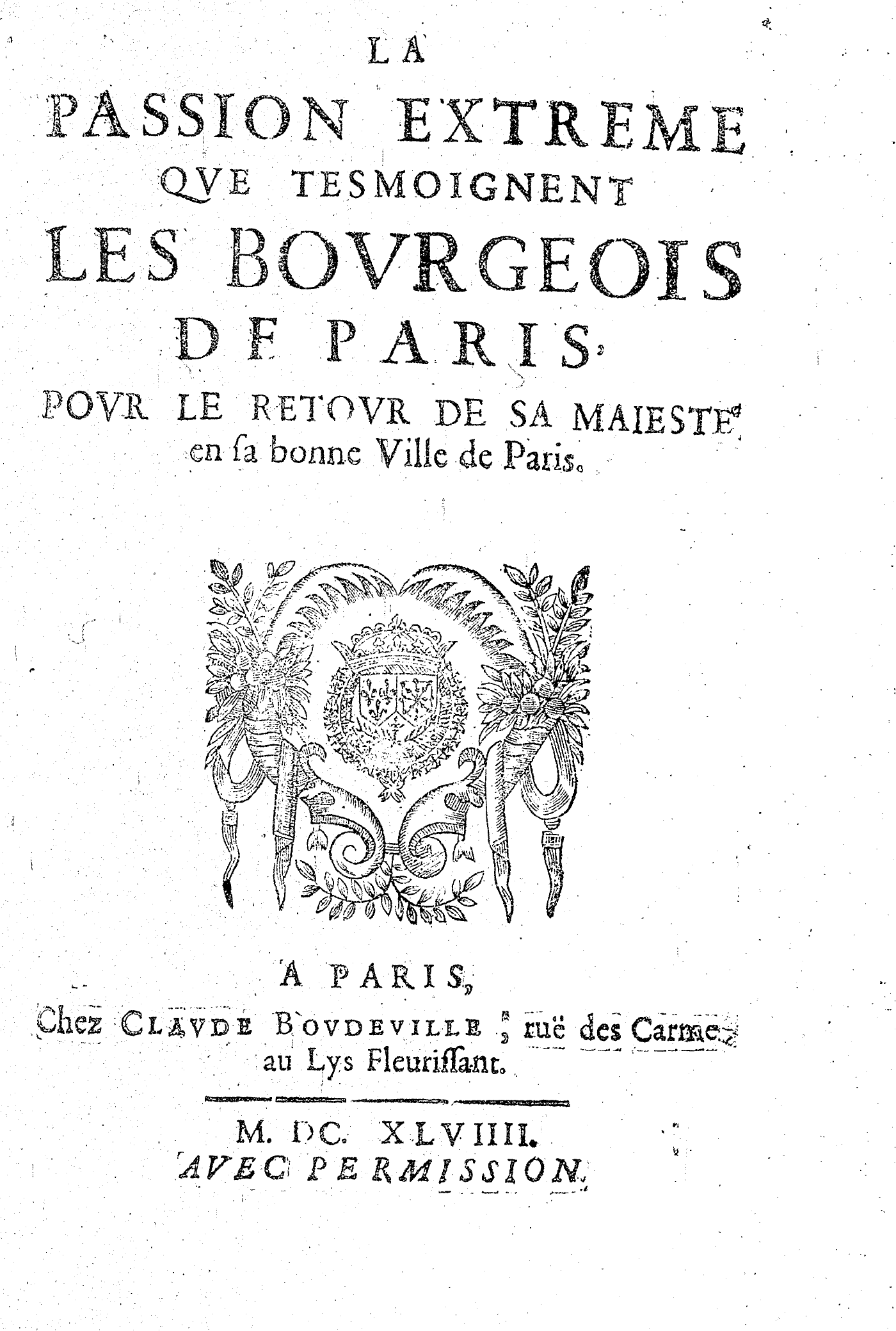 LA PASSION EXTREME QVE TESMOIGNENT LES BOVRGEOIS DE PARIS, POVR LE RETOVR DE SA MAIESTE en sa bonne Ville de Paris.