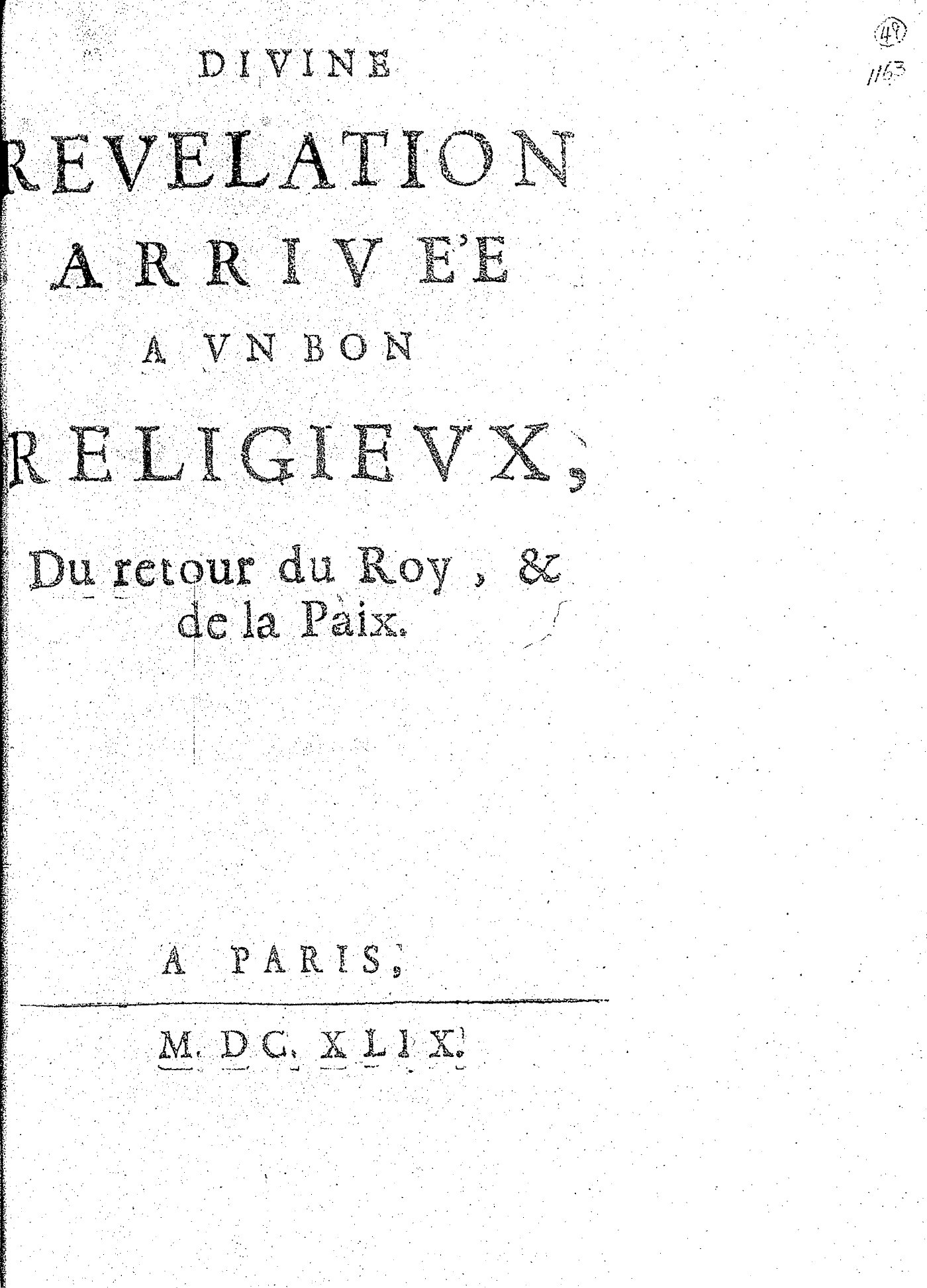 DIVINE REVELATION ARRIVÉE A VN BON RELIGIEVX, Du retour du Roy, & de la Paix.
