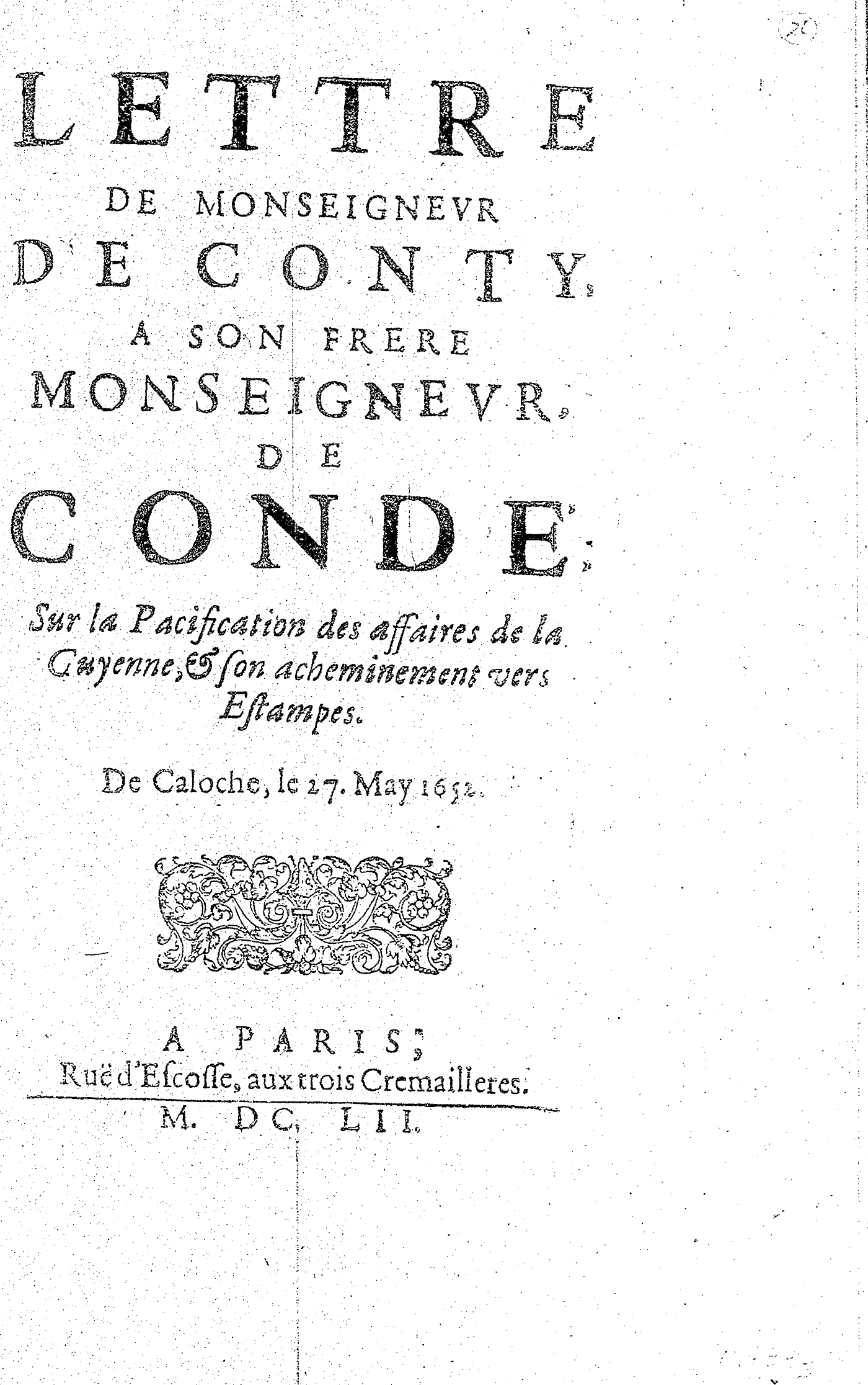 LETTRE DE MONSEIGNEVR DE CONTY, A SON FRERE MONSEIGNEVR, DE CONDÉ, Sur la Pacification des affaires de la Guyenne, & son acheminement vers Estampes. De Caloche, le 27. May 1652.