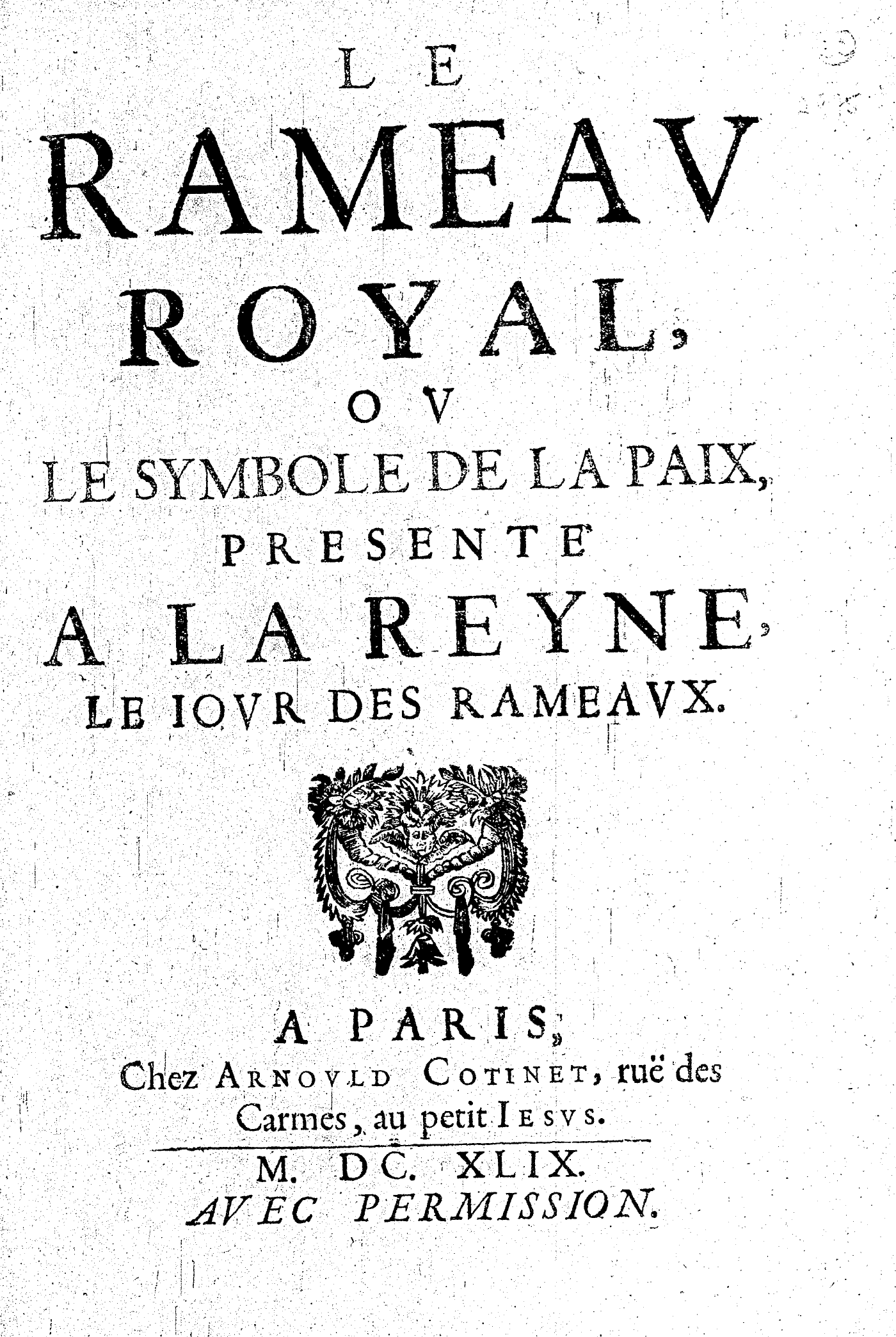 LE RAMEAV ROYAL, OV LE SYMBOLE DE LA PAIX, PRESENTÉ A LA REYNE, LE IOVR DES RAMEAVX.