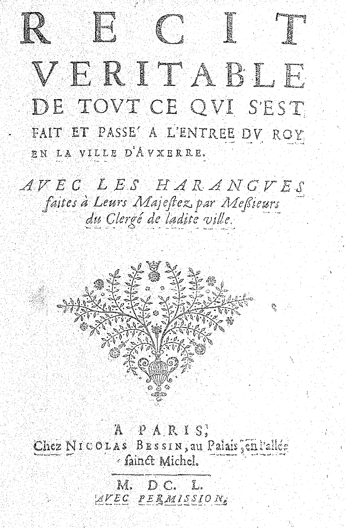 RECIT VERITABLE DE TOVT CE QVI S’EST FAIT ET PASSÉ A L’ENTREE DV ROY EN LA VILLE D’AVXERRE. AVEC LES HARANGVES faites à Leurs Majestez par Messieurs du Clergé de ladite ville.