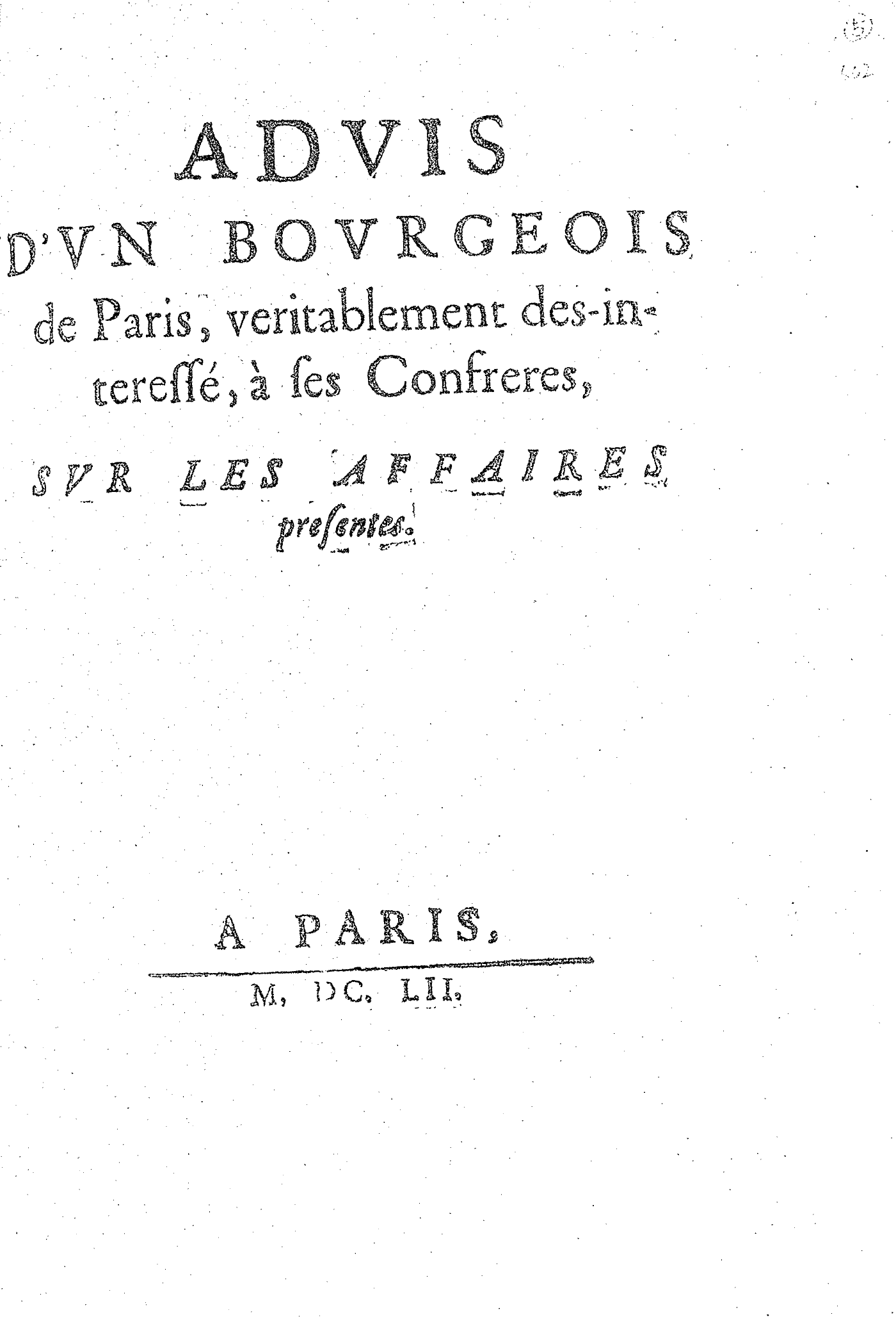 ADVIS D’VN BOVRGEOIS de Paris, veritablement des-interessé, à ses Confreres, SVR LES AFFAIRES presentes.