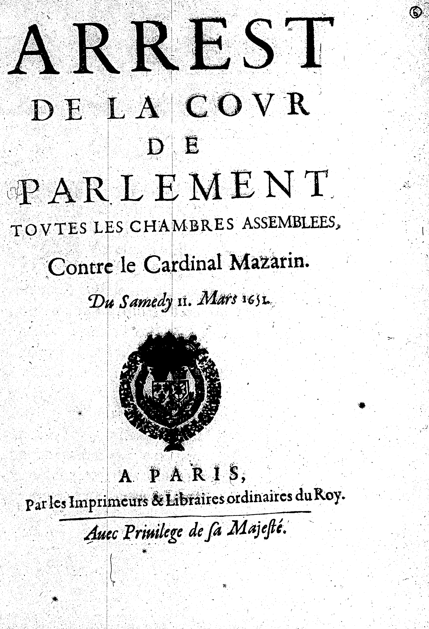 ARREST DE LA COVR DE PARLEMENT TOVTES LES CHAMBRES ASSEMBLEES, Contre le Cardinal Mazarin.