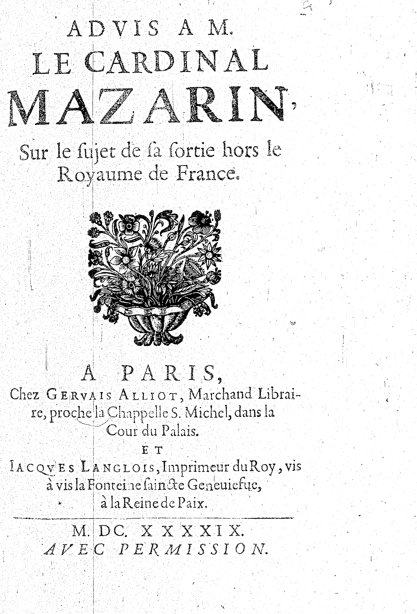 ADVIS A M. LE CARDINAL MAZARIN, Sur le sujet de sa sortie hors le Royaume de France.